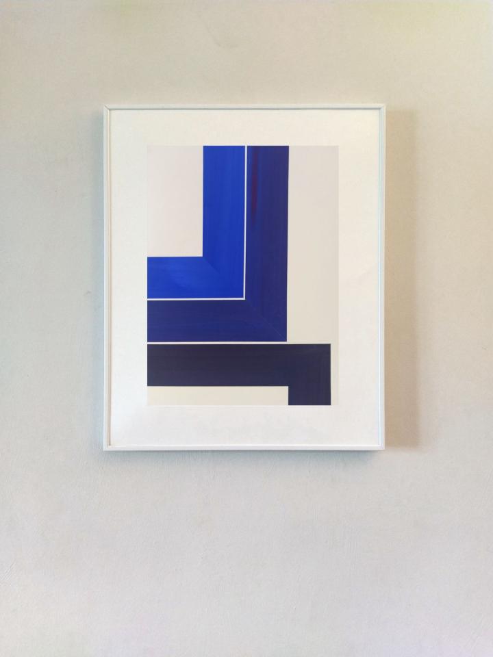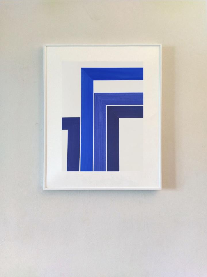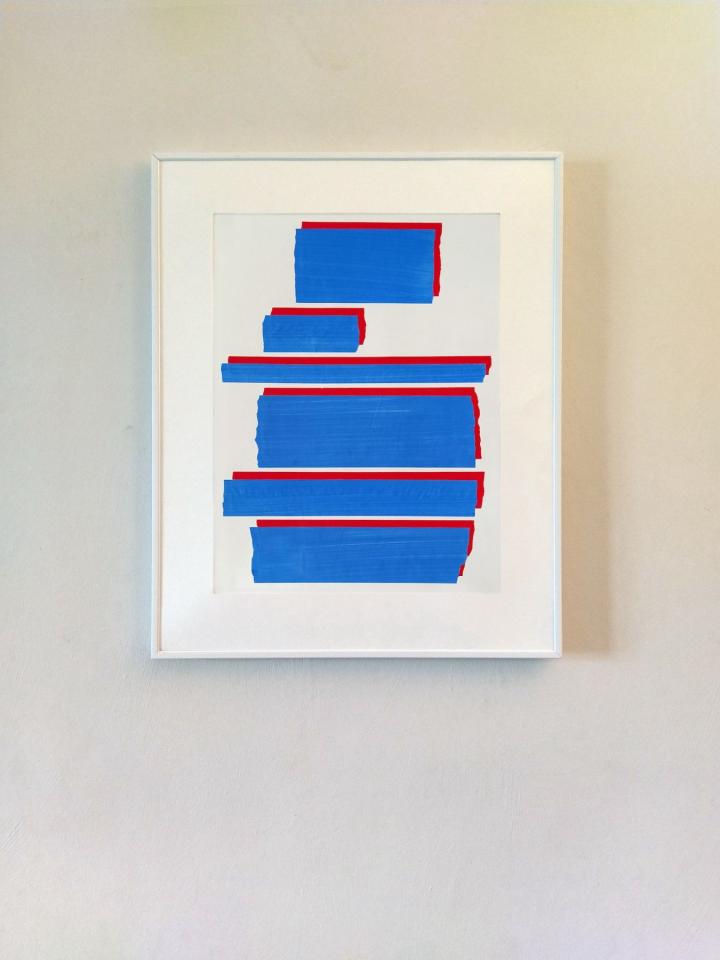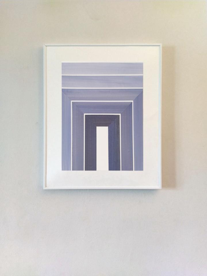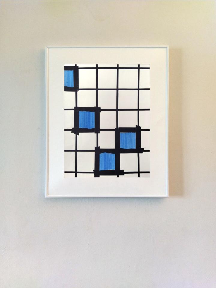 Mes réalisations de collages de papiers gouachés se déploient en séries construites sur une grille de lignes horizontales et verticales structurant la surface.