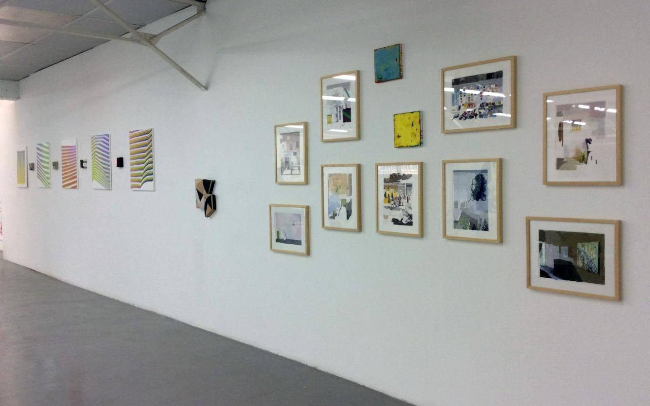 Accrochage d’une sélection de gouaches tirée de la série In Situ et œuvres de Philippe Lamy et Véronique Barthe issues de la collection personnelle de l’artiste ; à gauche ensemble de peintures tirées de la série Ne pas plier et œuvres de Pierre Fisher ; en premier plan œuvres de Stephen Marsden, photo Damien Aspe
