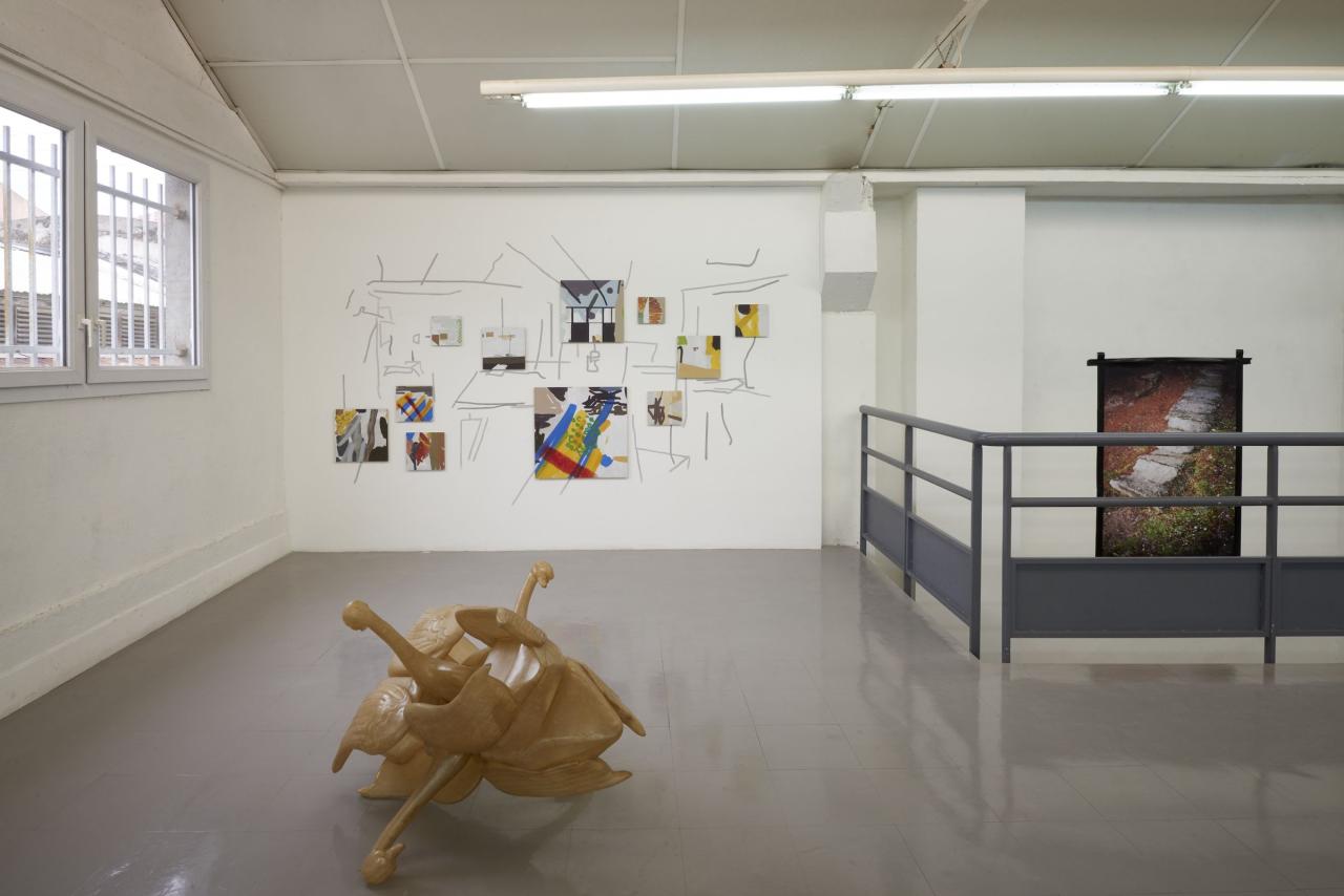 In Situ Lieu-Commun, 2018, peinture sur mur, acrylique sur papier contrecollé sur plaques de medium, détail ; en premier plan œuvre de Stephen Marsden, à droite œuvre d’Eliot Delahaye, photo Damien Aspe