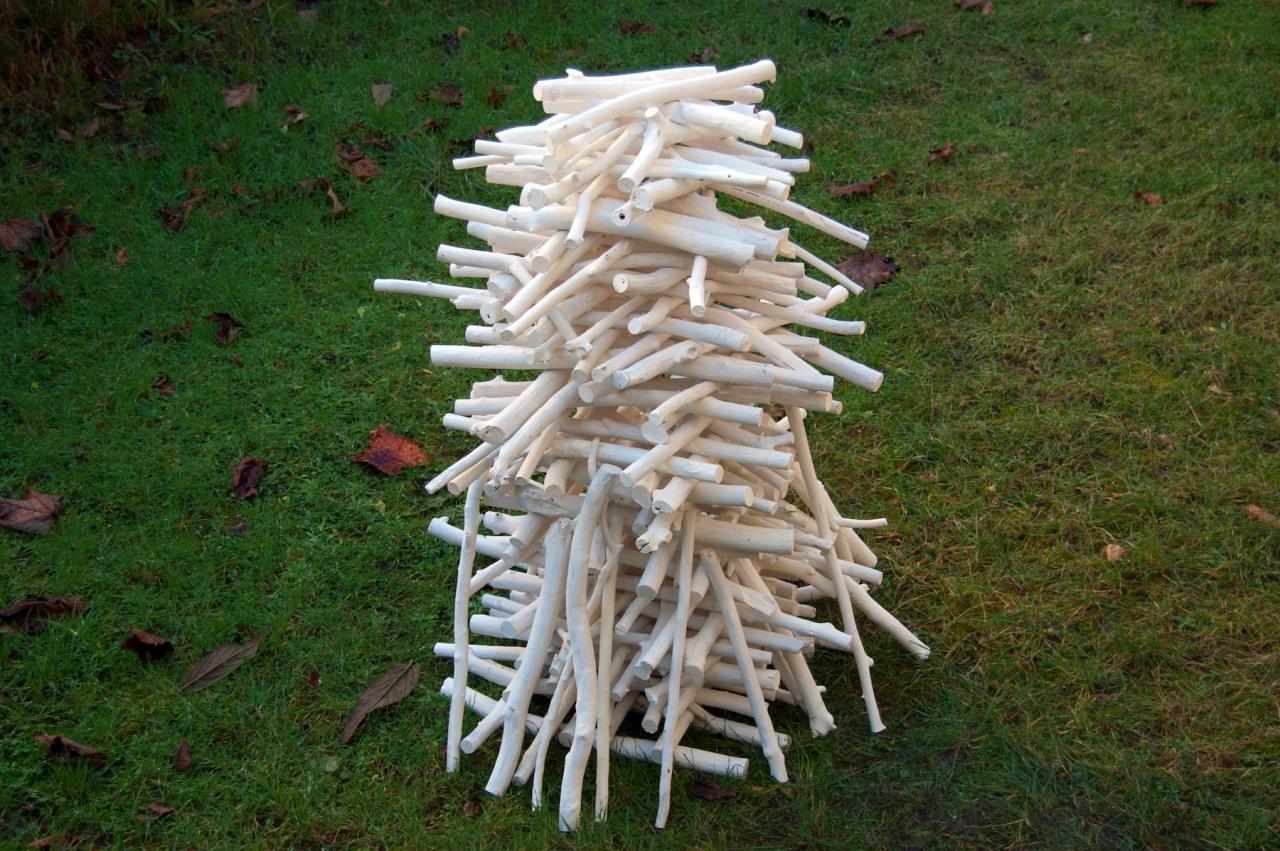 En 2012, je ramasse du bois dans cette forêt et le fais sécher. Je coupe les branches à la longueur d’un mollet, environ, et les enduit d’un mélange de colle de peau et de craie.