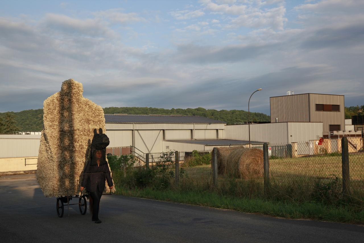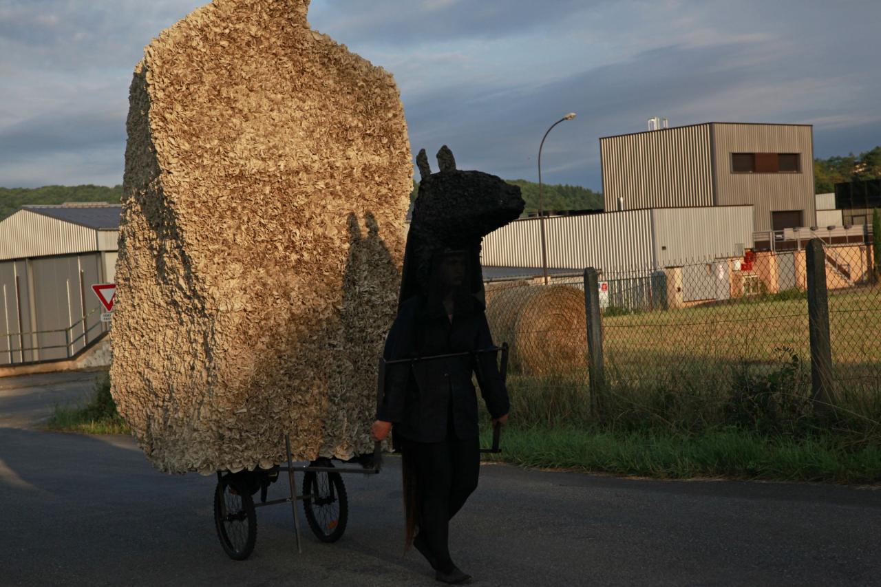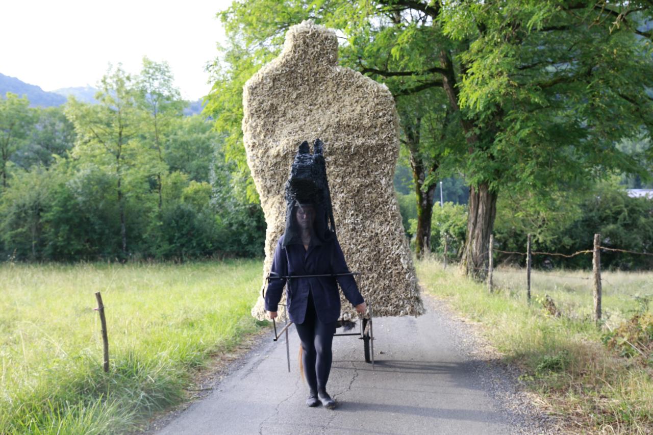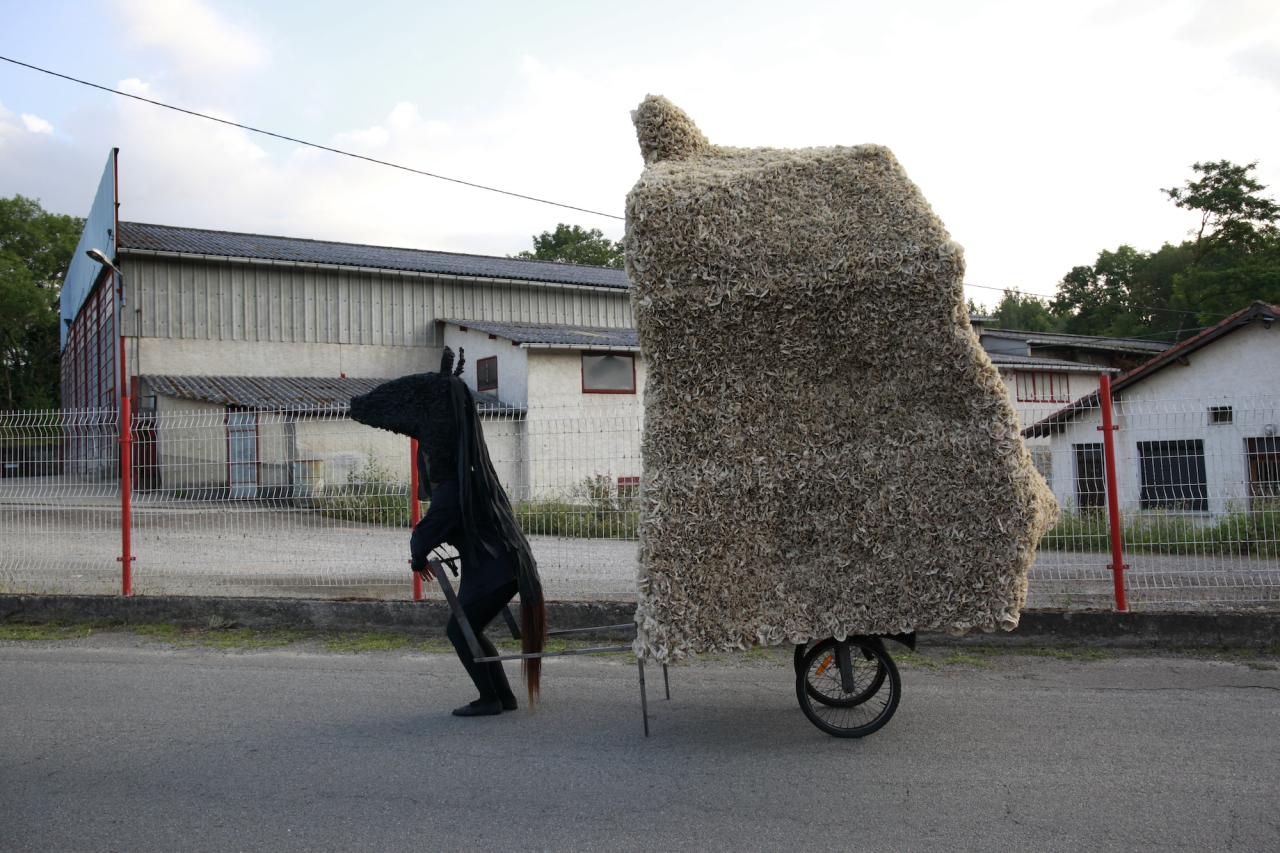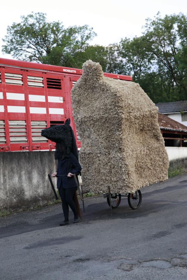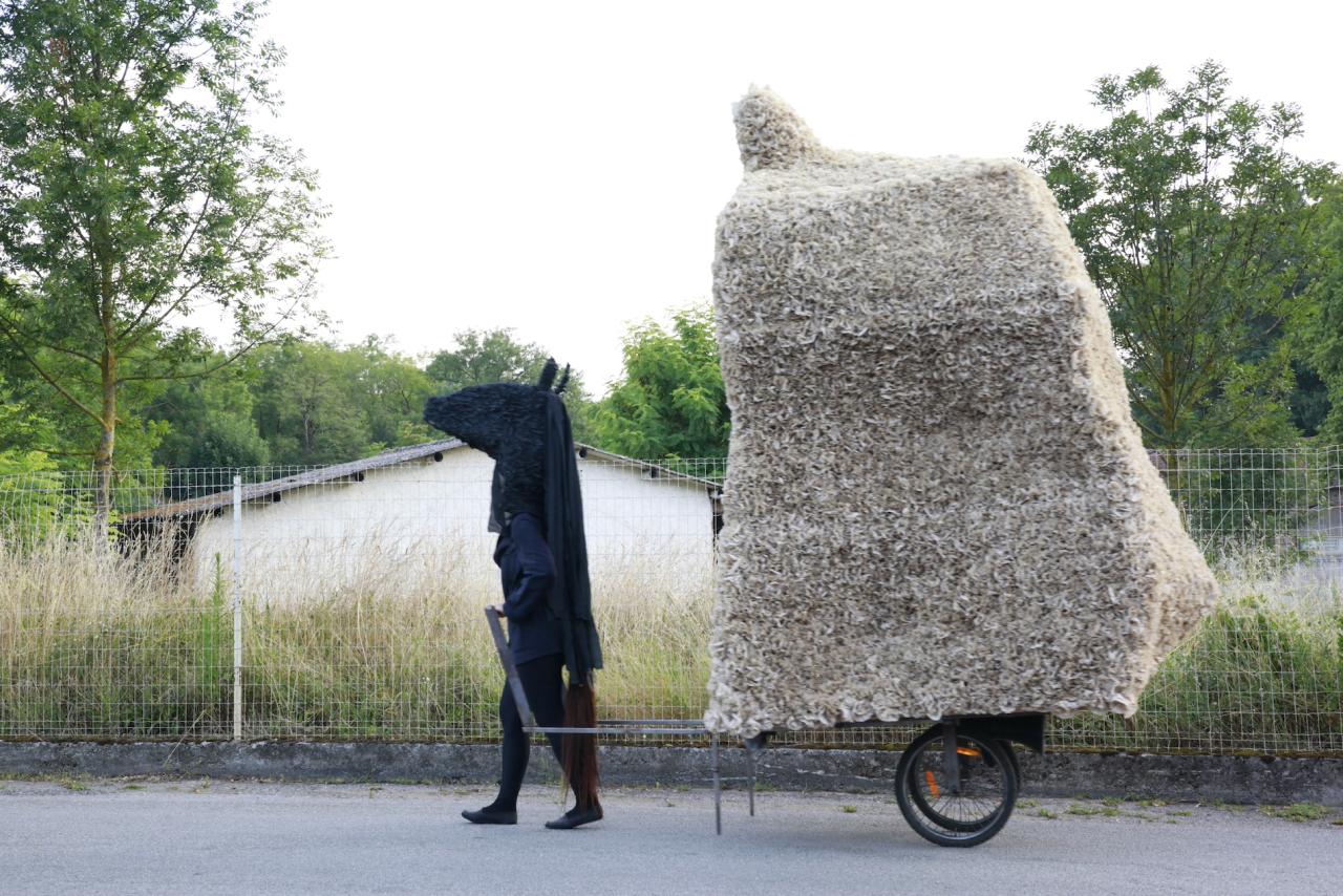 Cavalcade était prévue comme une intrusion dans le corso fleuri de Villefranche-de-Rouergue. Prenant acte de ce qu’était finalement ce printemps 2020, je réalisais un char pour une personne et défilais dans la zone industrielle au petit matin, accompagnée d’un rythme dissonant de sabots, sans interaction avec qui que ce soit.