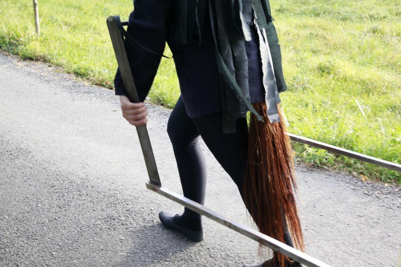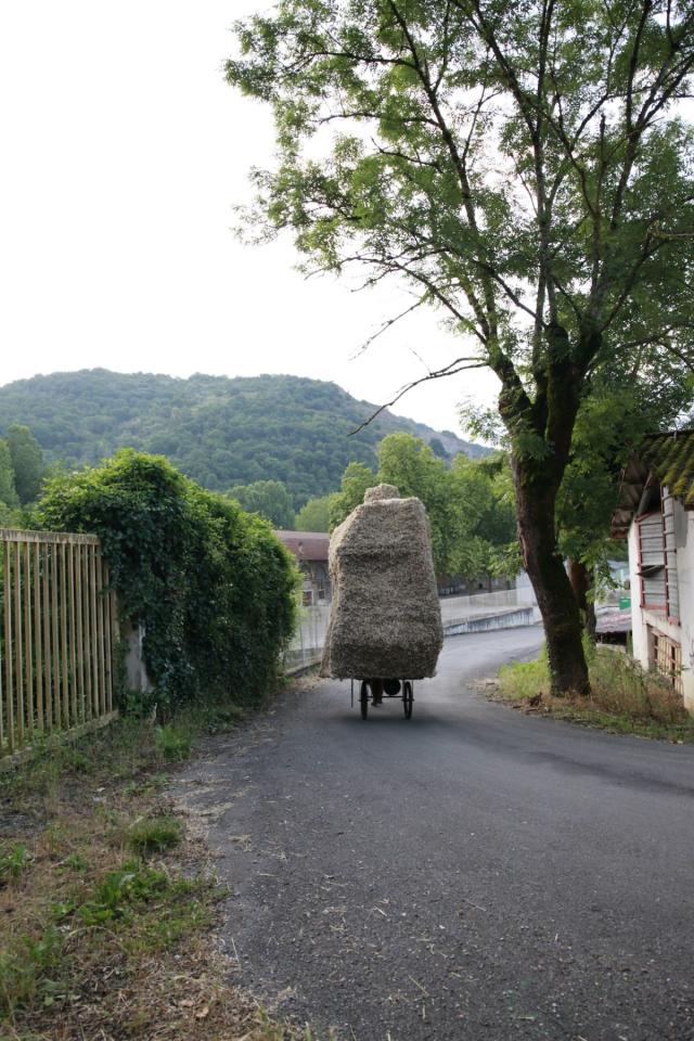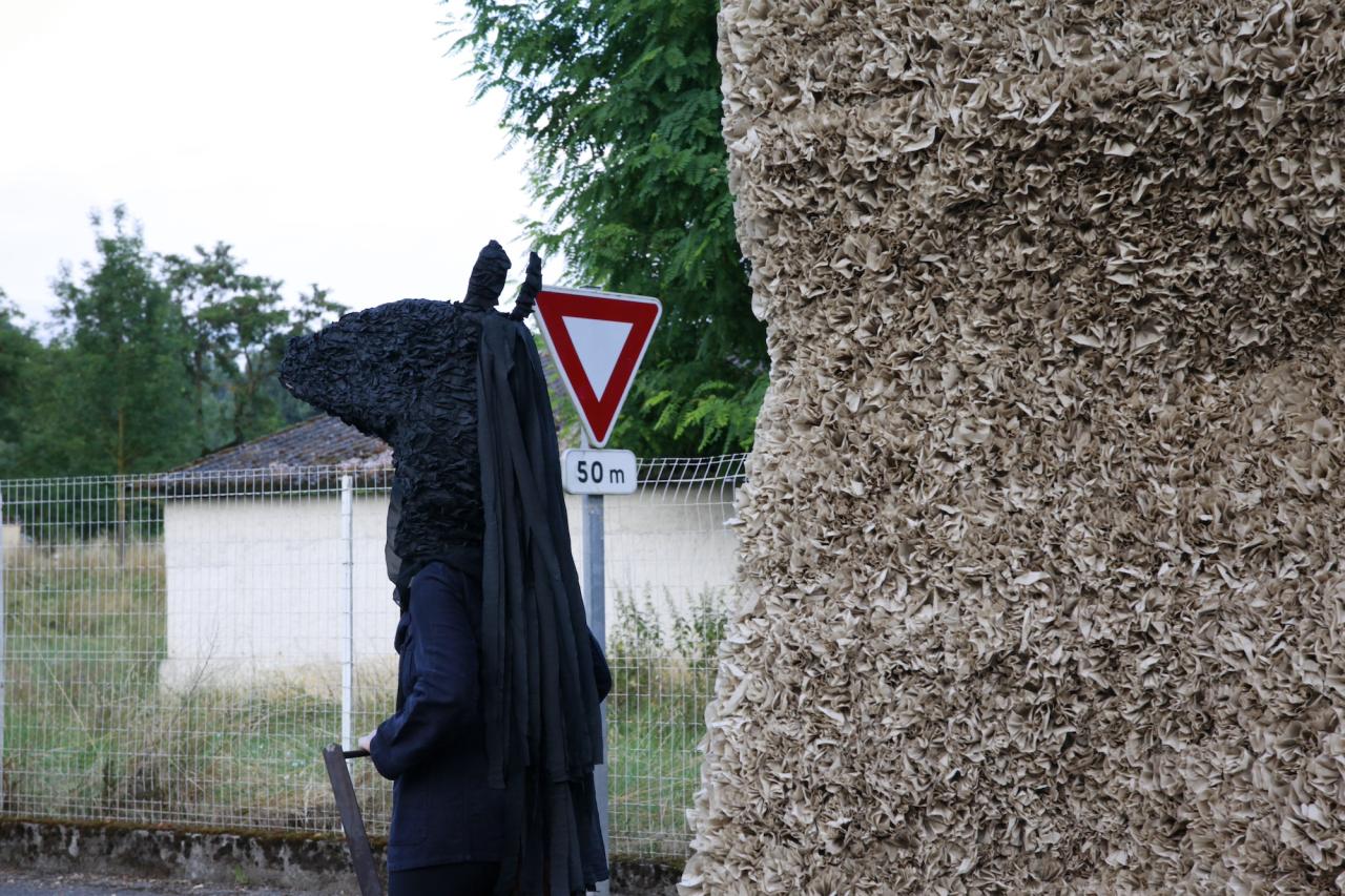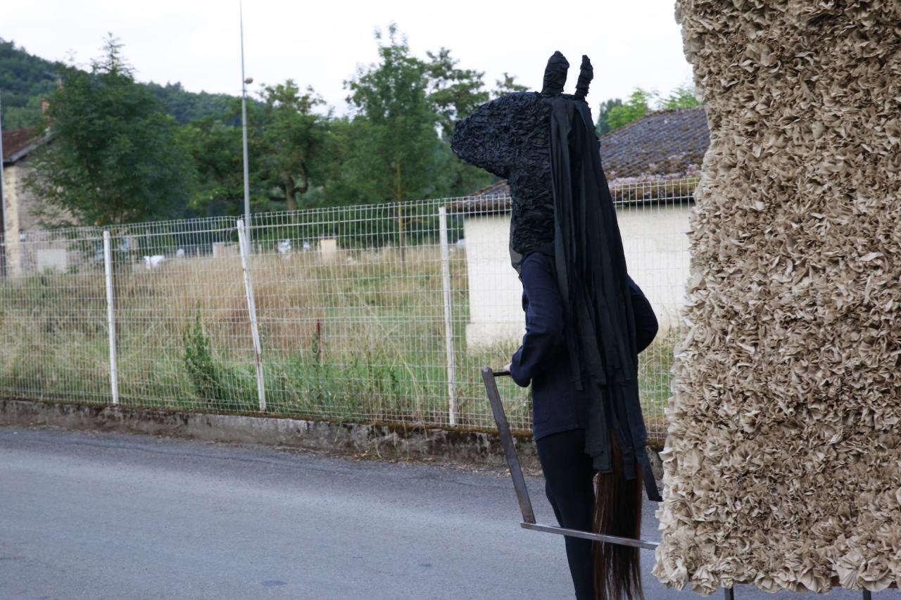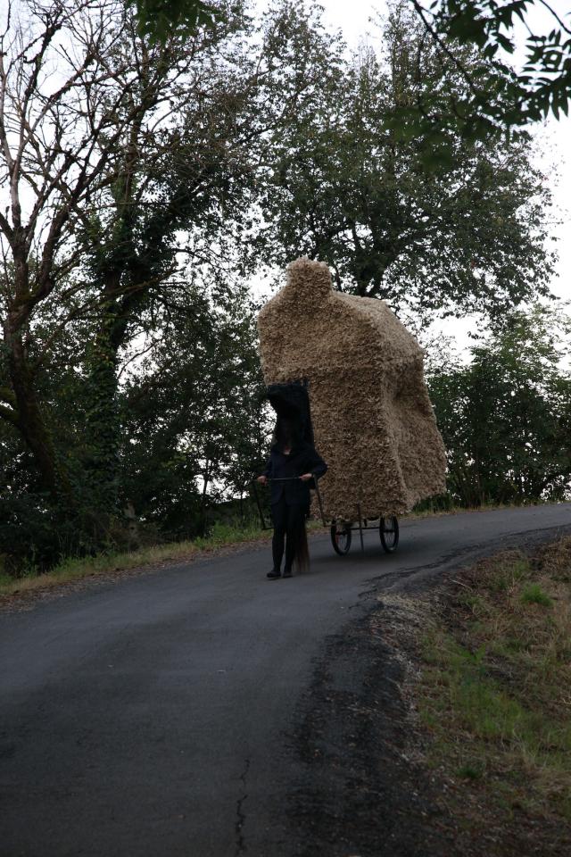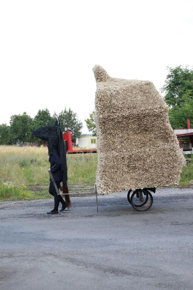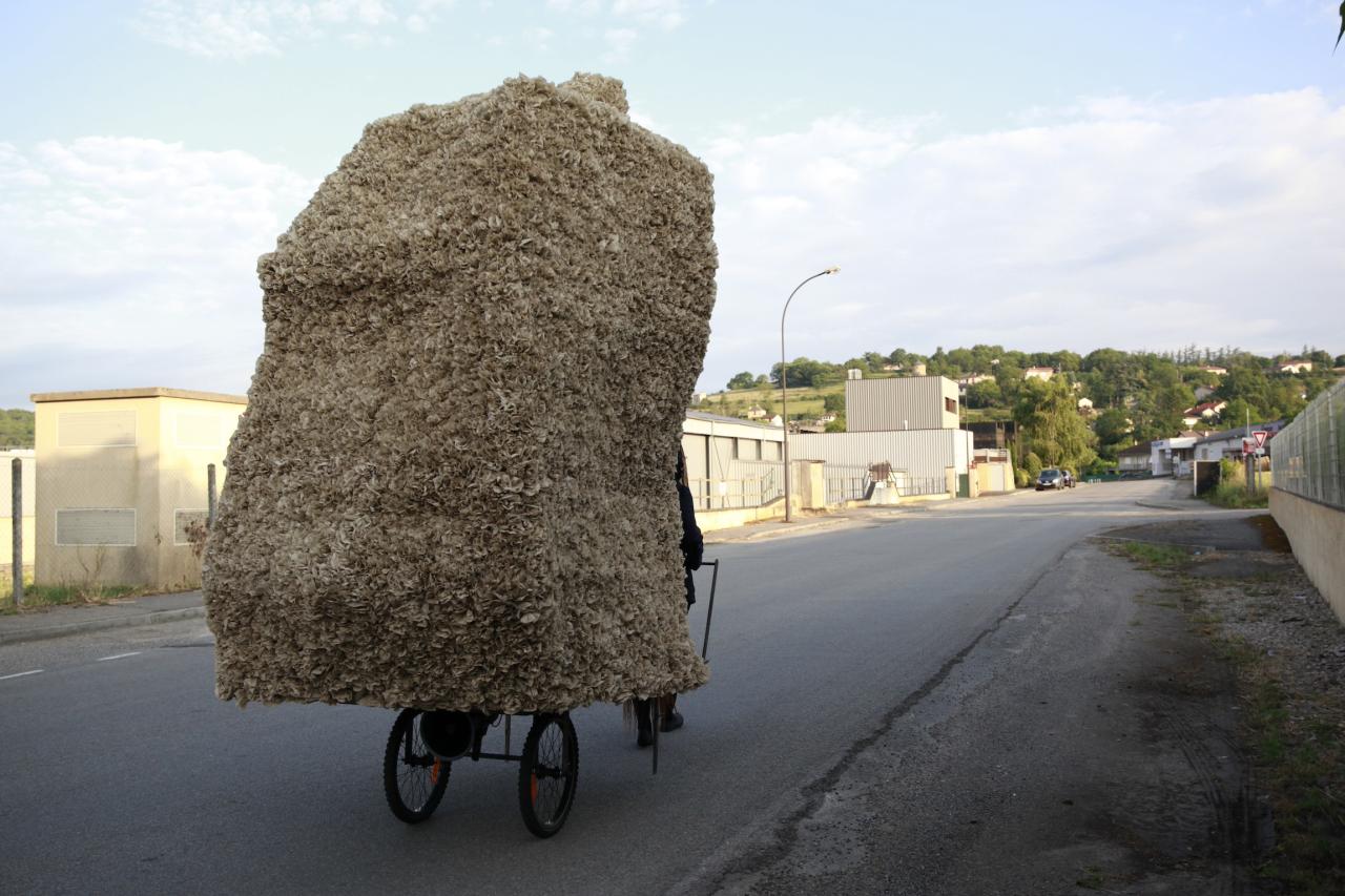 Cavalcade était prévue comme une intrusion dans le corso fleuri de Villefranche-de-Rouergue. Prenant acte de ce qu’était finalement ce printemps 2020, je réalisais un char pour une personne et défilais dans la zone industrielle au petit matin, accompagnée d’un rythme dissonant de sabots, sans interaction avec qui que ce soit.