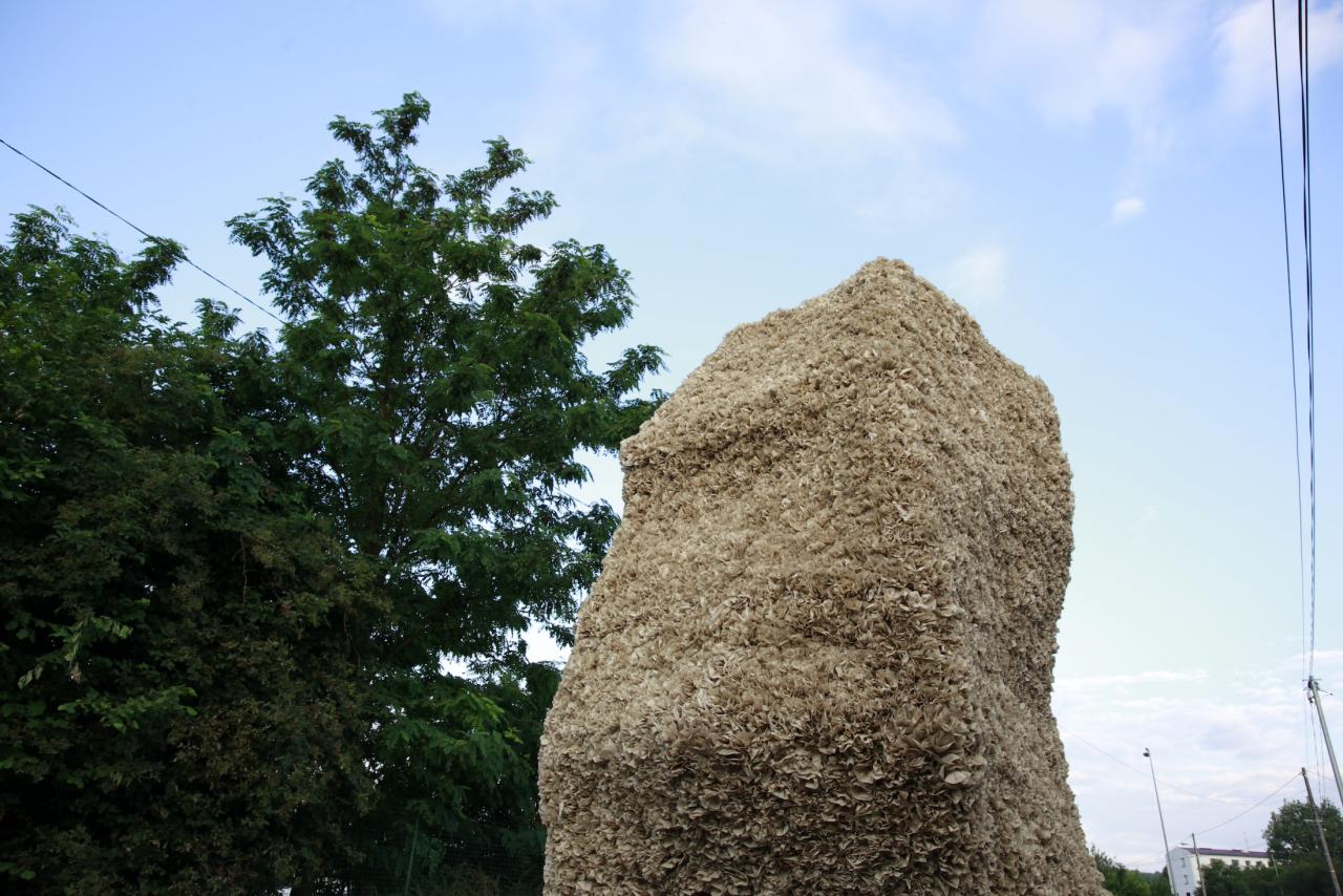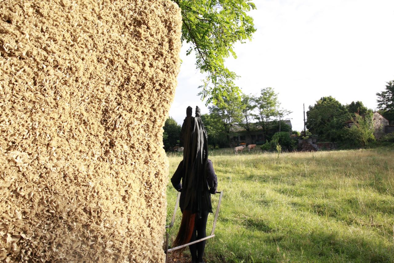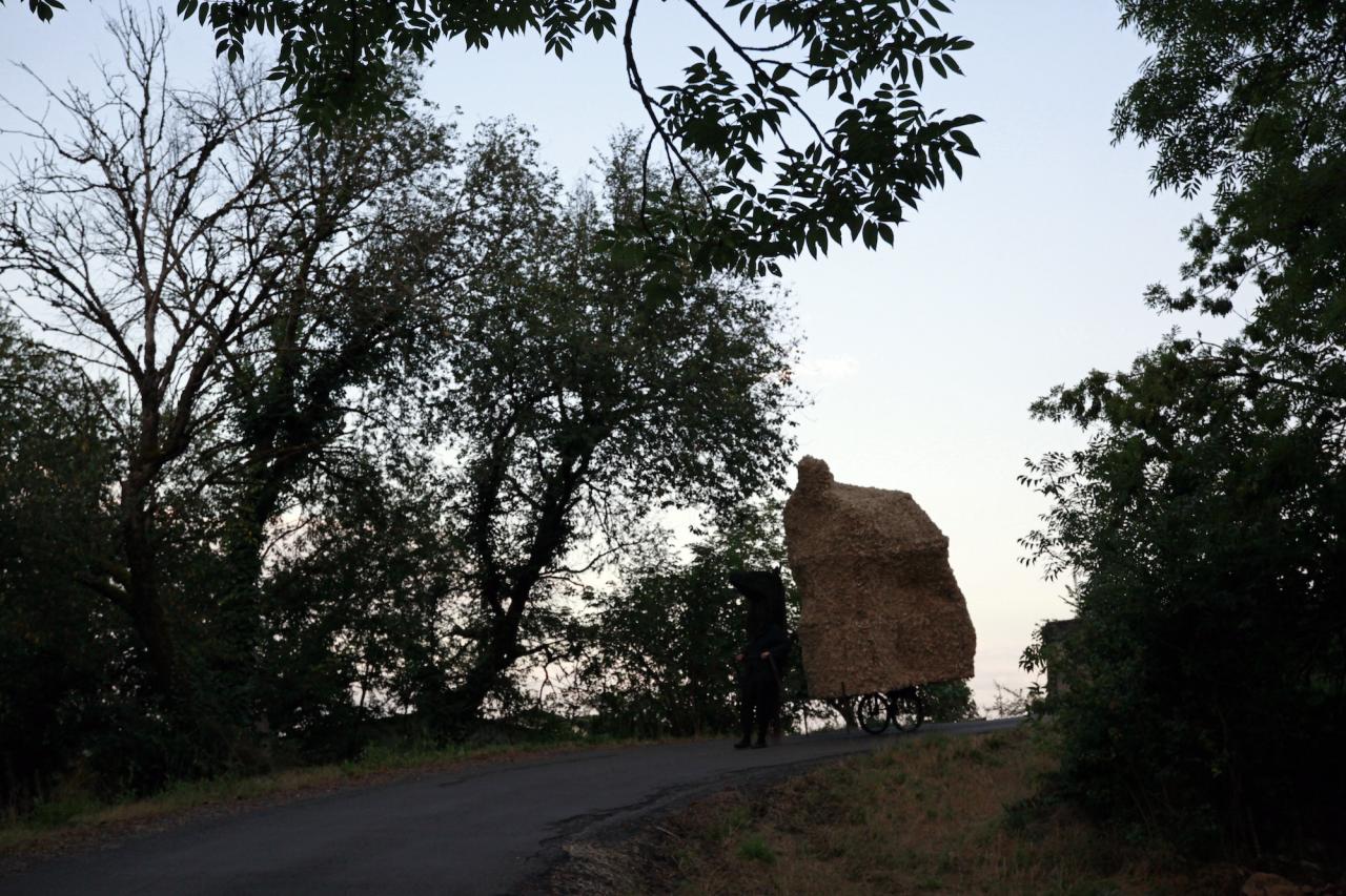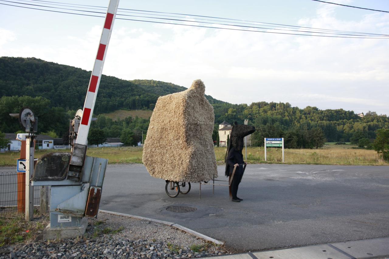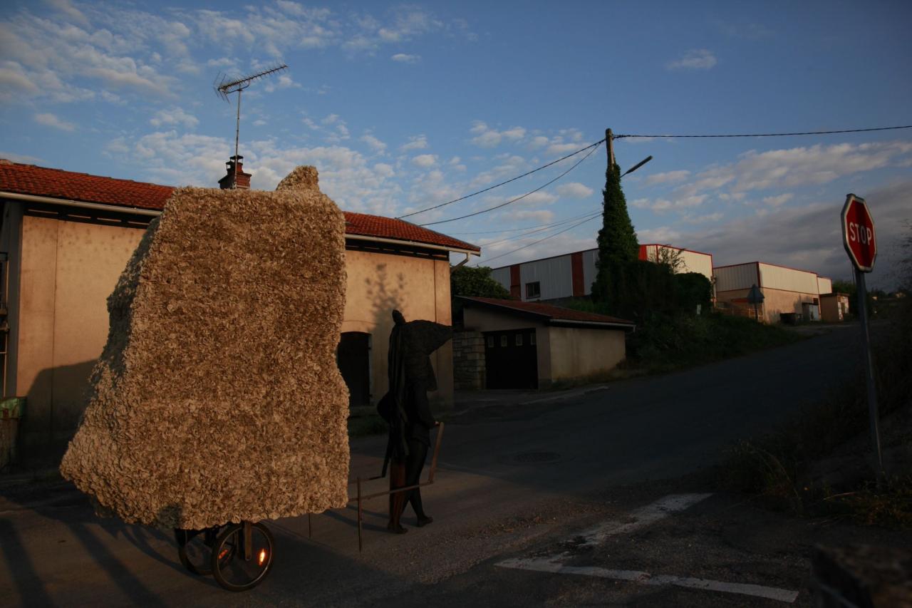 Cavalcade était prévue comme une intrusion dans le corso fleuri de Villefranche-de-Rouergue. Prenant acte de ce qu’était finalement ce printemps 2020, je réalisais un char pour une personne et défilais dans la zone industrielle au petit matin, accompagnée d’un rythme dissonant de sabots, sans interaction avec qui que ce soit.