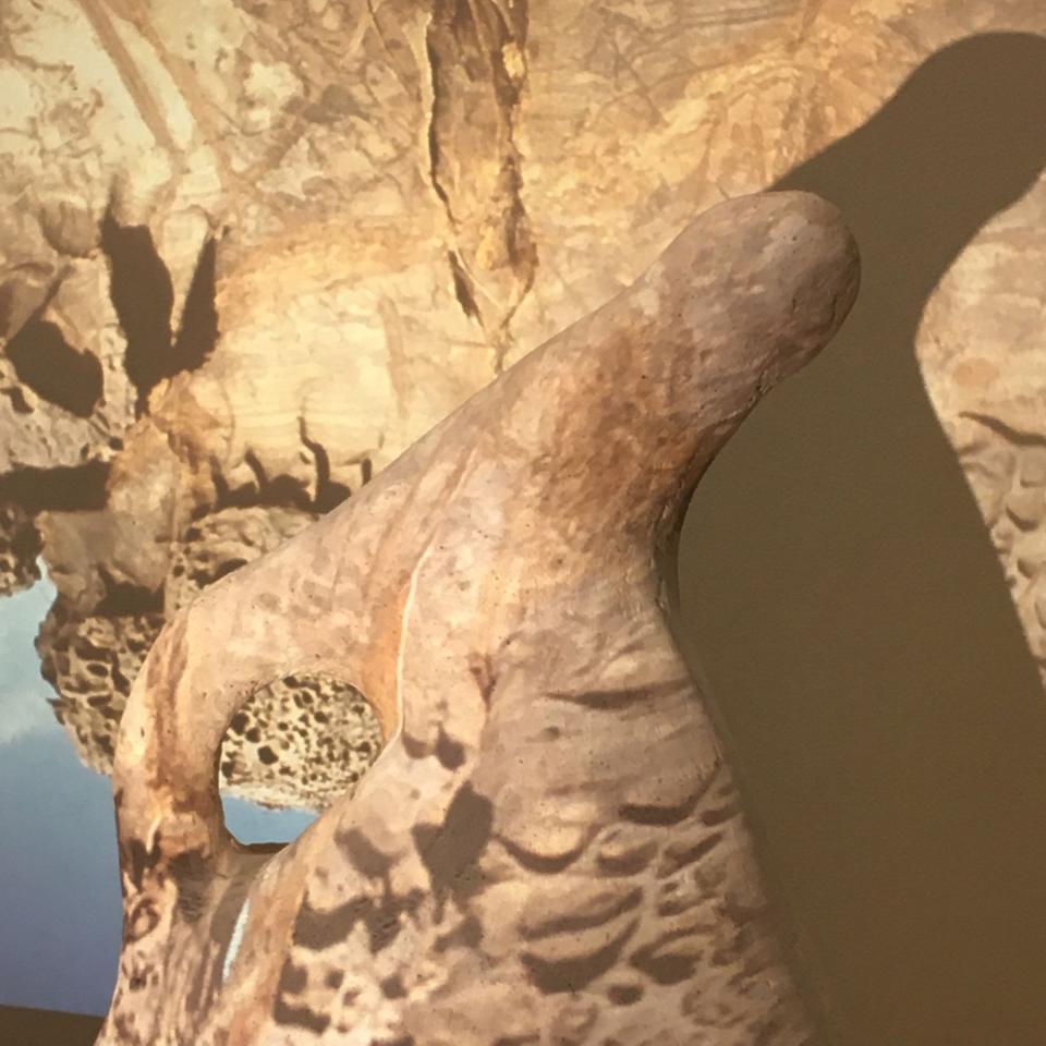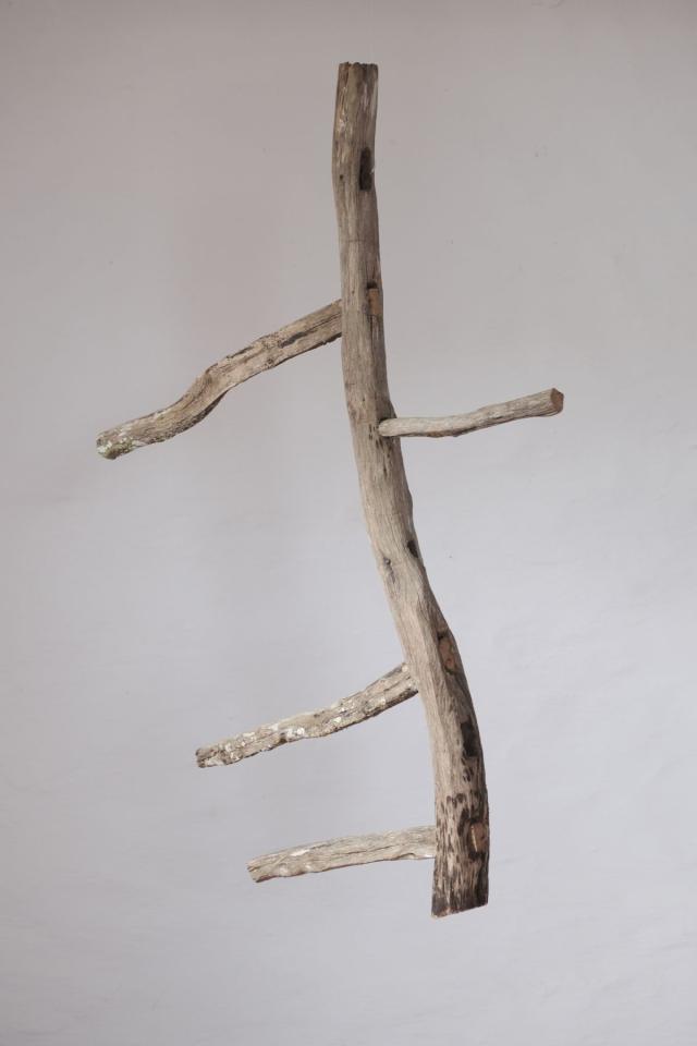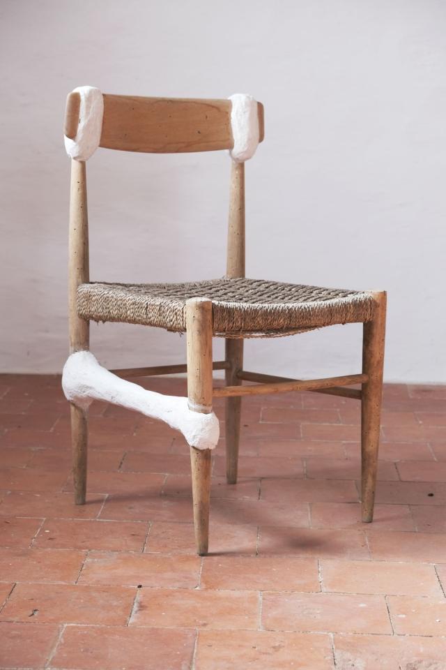 Idiolecte, 2020, plâtre, alfa, bois d’olivier sauvage, cuir, cordages synthétiques, teintures végétales, soie, fer, pierre