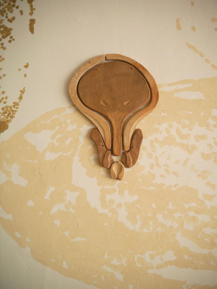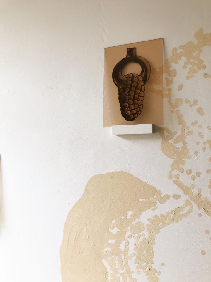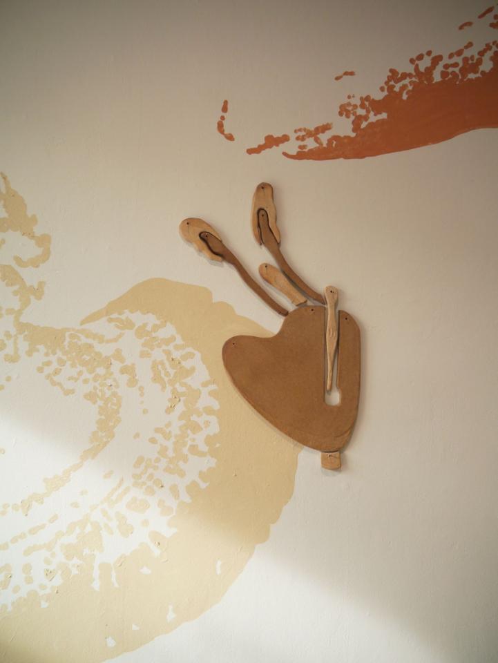 Fidèle à mes habitudes, je porte attention à l’environnement dans lequel j’évolue et y récolte matières, sensations, histoires. Je convoque des objets et leurs usages avec des pratiques et des formes singulières et tente de leur restituer des affects effacés. Ici, du bois, des souvenirs de grotte, la lumière d’un verre teinté.