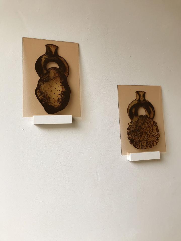 Verre soufflé, grisaille et sels d’argent sous verre, argile, laine, coton, zinc, bouleau, châtaigner, grès cuit au bois, terre cuite, datura, cardère, coton, teinture végétale, foin, photographie argentique