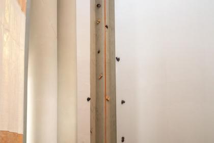 Elle invente une fonction à l’ornemental du lieu. Les colonnes, autour desquelles elle vient placer ses objets, ne sont plus le vestige d’une architecture spirituelle, mais une échelle organique vers une nouvelle perception. Ses prises d’escalade appellent le corps à penser son élévation, non plus mystique, mais sensuelle. Elle tend une main calleuse, nous hissant dans les rondeurs des colonnades. On peut désormais s’y lover, comme un animal se glisserait entre deux troncs. On suit du regard les repères de bois et de céramique comme une piste empruntée par un individu arboricole. Chemin énigmatique frayé vers un autre monde, dans une paroi naturelle synthétique, menant à la frondaison corinthienne, nid d’acanthe fossilisée.