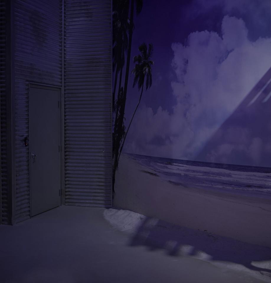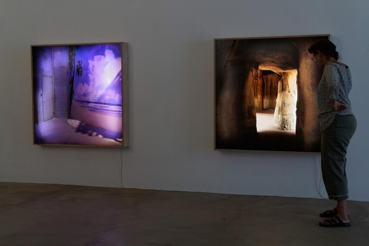 Caissons lumineux, 2018, impression jour-nuit, 130 x 130 x 25 cm, vue de l’exposition Lieux Dits, MAGCP, centre d’art contemporain Cajarc, 2018