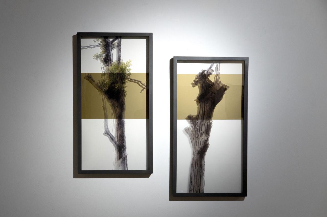 La forêt d’arbres morts du Lac de Petit Saut en Guyane accueille sur ces cimes des plantes épiphytes qui viennent chercher refuge. La photographie, silencieuse et frontale, capte ce qui, à première vue, semble déserté ou muet, voire vide. Dans un lien entre matière et image, l’impression sur verre trouble la lecture en révélant et effaçant ce paysage porteur de récits.