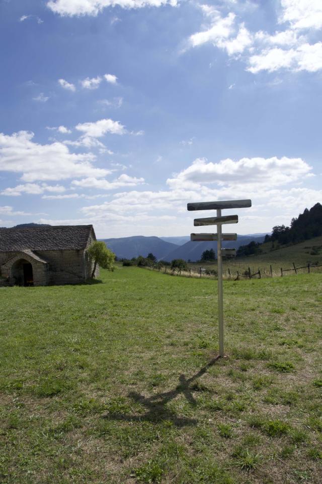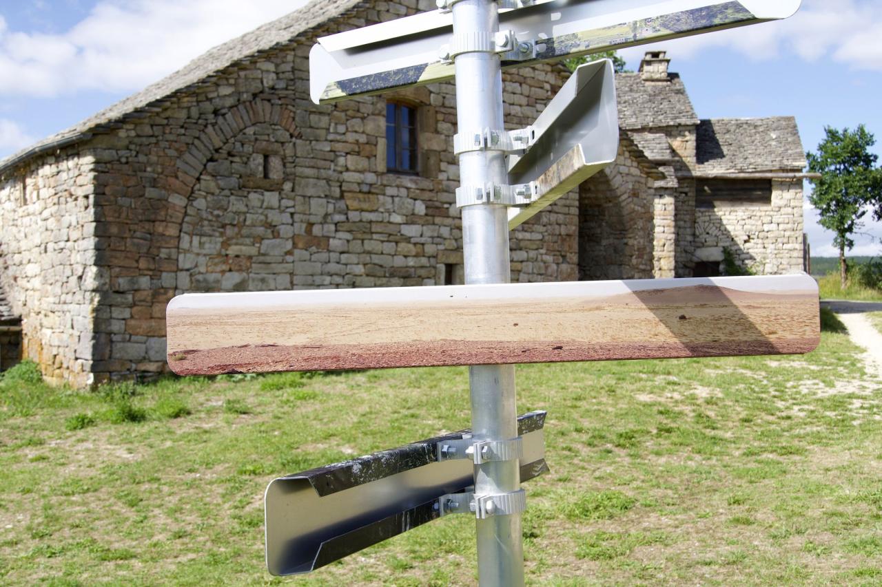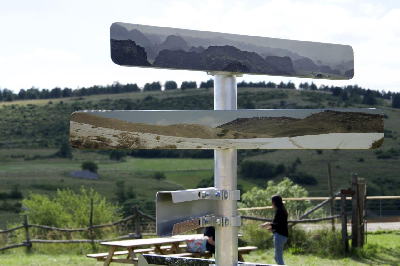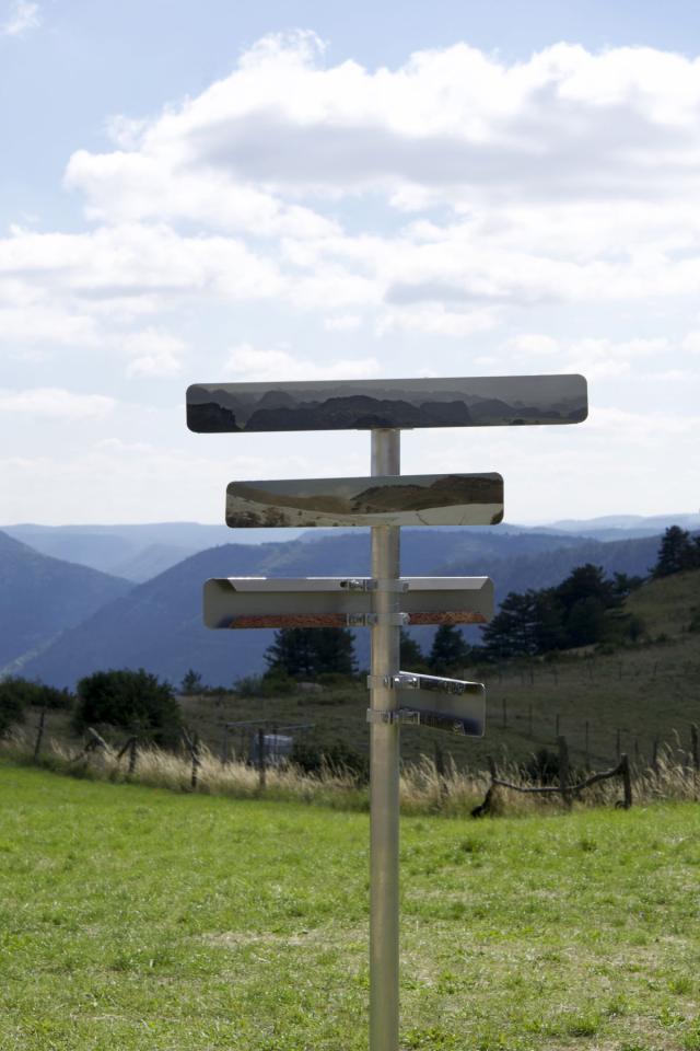 Le panneau est une invitation au regard. Il nous dit qu’ici peut être ailleurs. Objet sculptural en immersion dans le site, il indique quatre directions qui sont mises en relation visuelle avec l’arrière-plan que forme le paysage. Les images choisies, toutes liées à des projets artistiques et à des voyages d’Éléna Salah, font résonner la mémoire de l’artiste avec le paysage présent et en révèle certains aspects.
