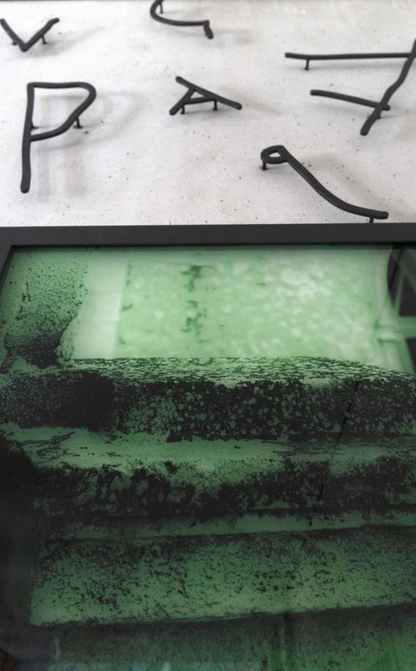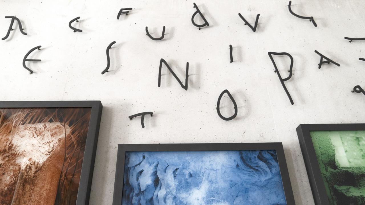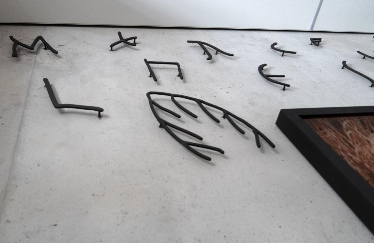 Les lettres en métal sont extraites des graffitis gravés sur les fragments retrouvés. Elles investissent le haut du mur, flottantes dans l’air et proposent une nouvelle lecture. J’inverse les dynamiques du plein et du vide mais je conserve la fragilité du geste de l’écriture dans la transposition en métal.