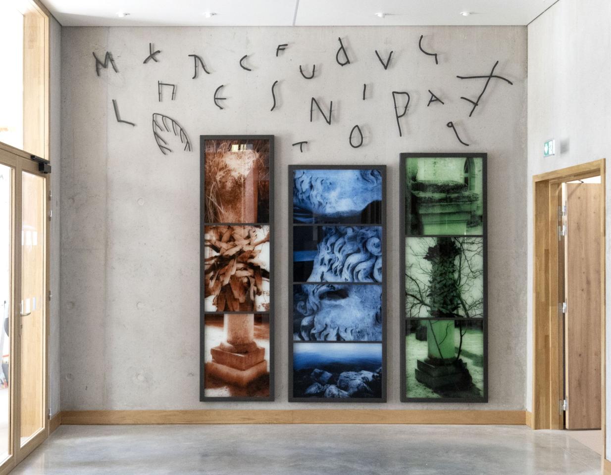 Fragments d’une correspondance est une œuvre pérenne répondant à une commande publique. Elle met en avant les missions de la médiathèque et les vestiges archéologiques découverts lors de sa construction.