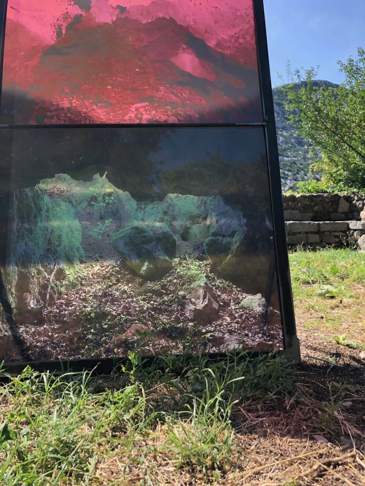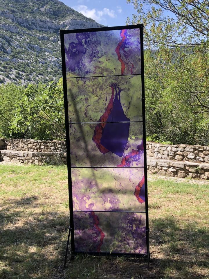 Les Ondes Silencieuses, 2023, installation in-situ, tirages sur verre, métal, 200 x 70 cm, 180 x 50 cm, 186 x 50 cm, vues de l’exposition collective Aux Bords des Paysages, Pégairolles-de-Buèges, commissariat Claire Schneider, détails.
