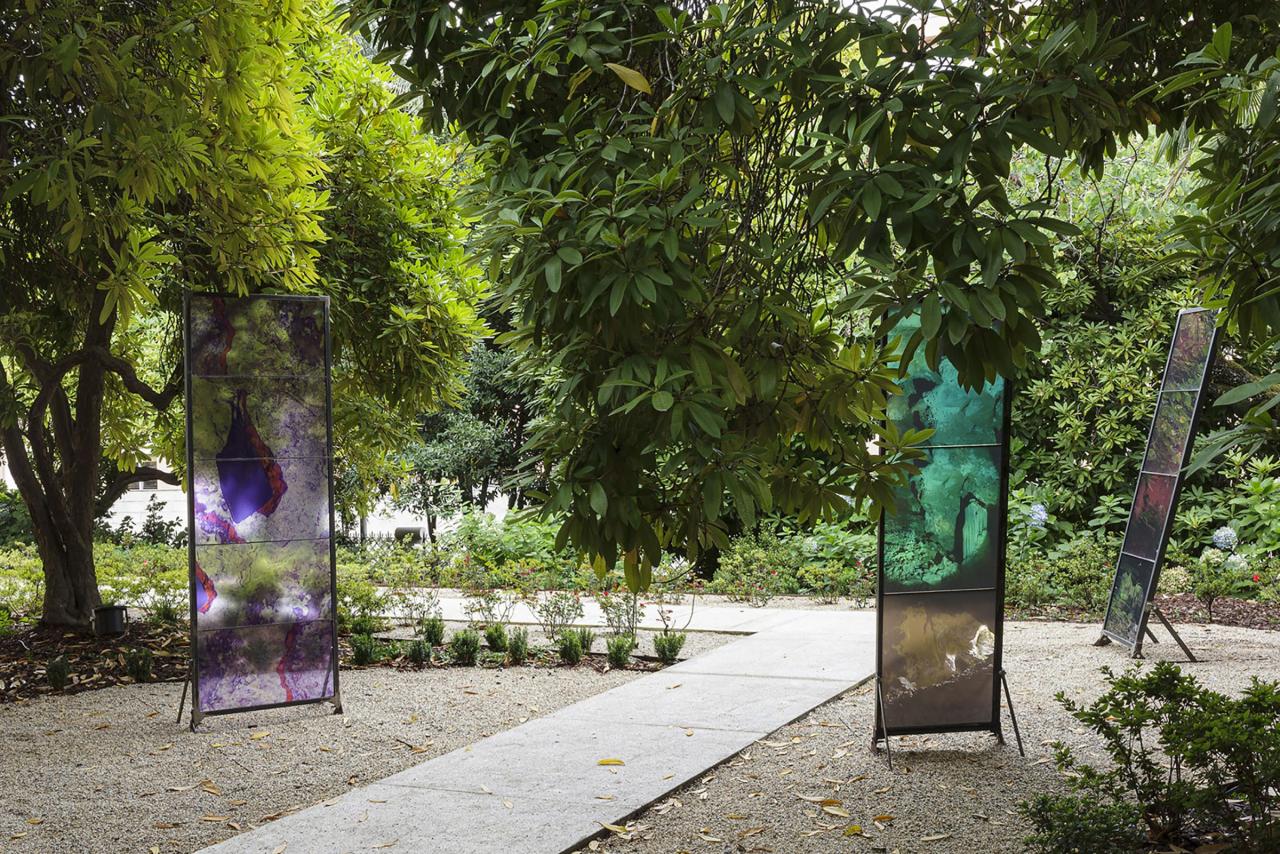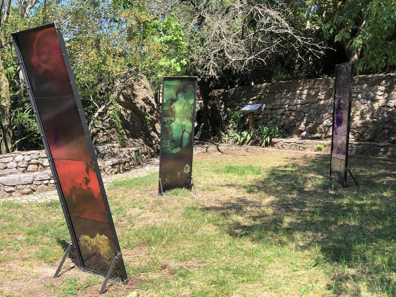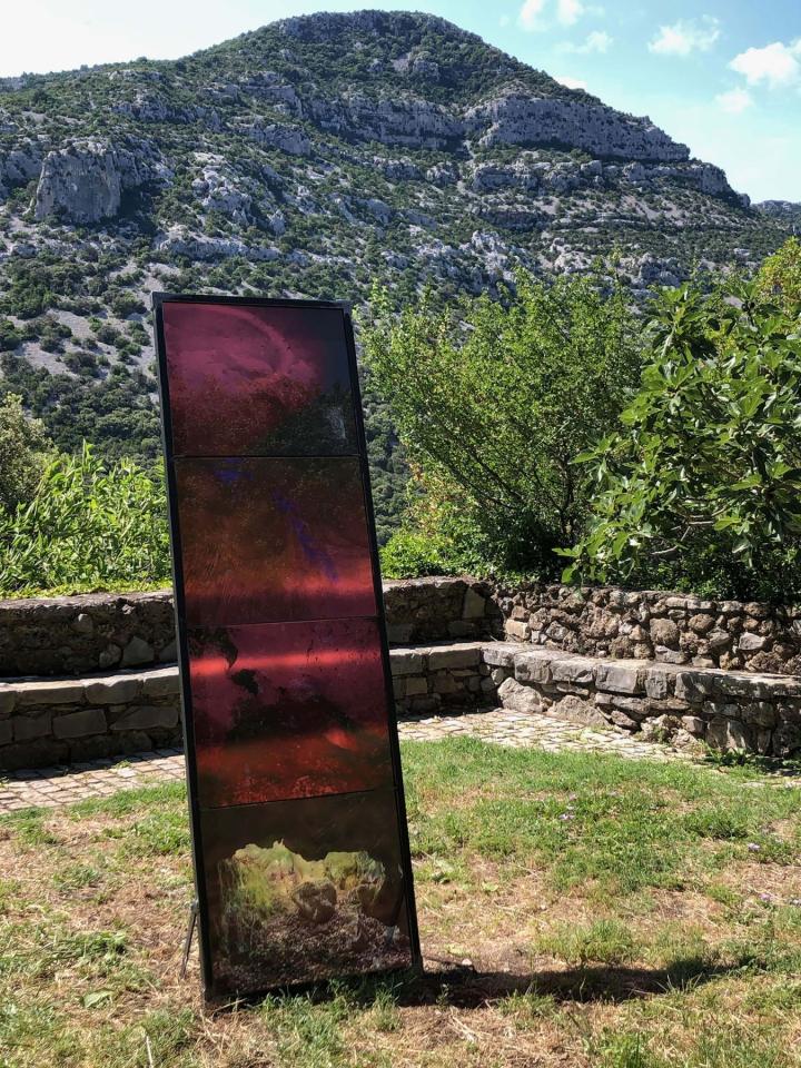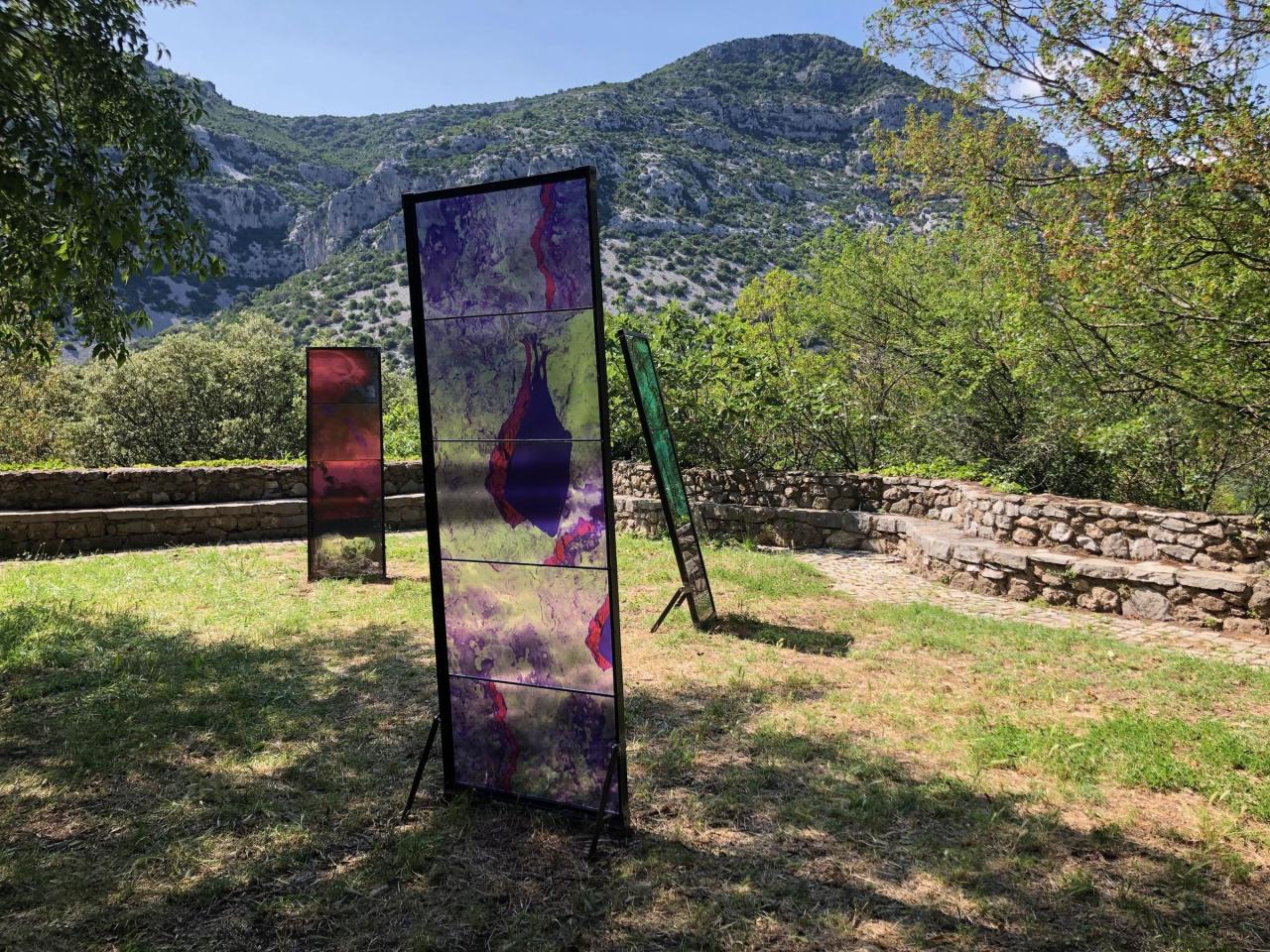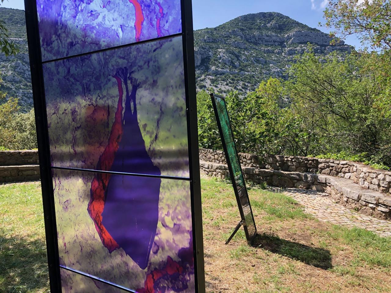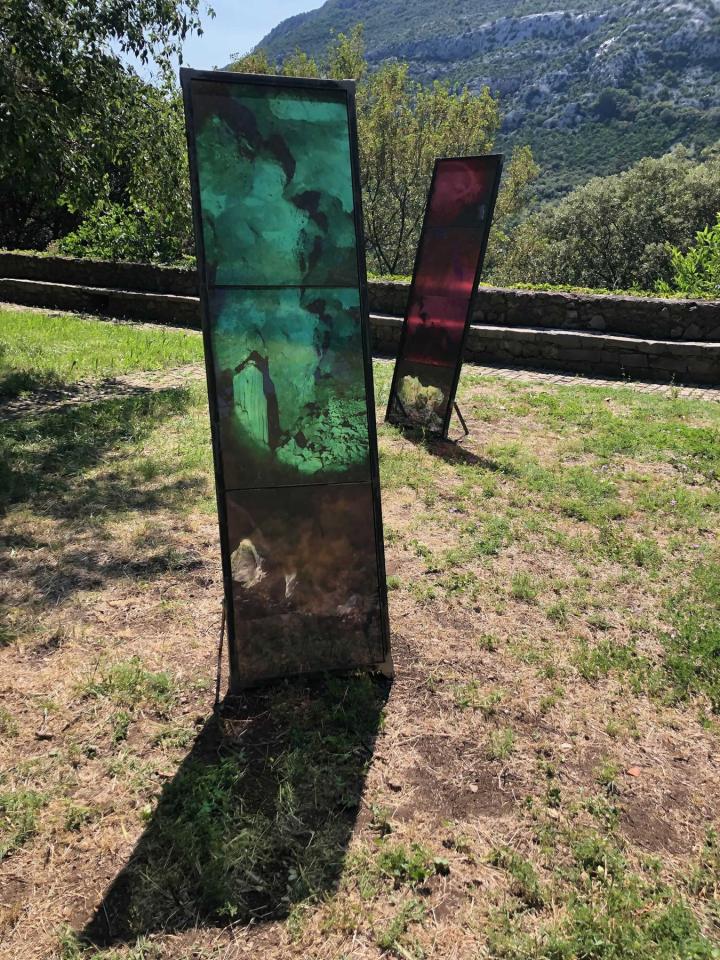 Les Ondes Silencieuses, 2023, installation in-situ, tirages sur verre, métal, 200 x 70 cm, 180 x 50 cm, 186 x 50 cm, vue de l’exposition collective Aux Bords des Paysages, Pégairolles-de-Buèges, commissariat Claire Schneider