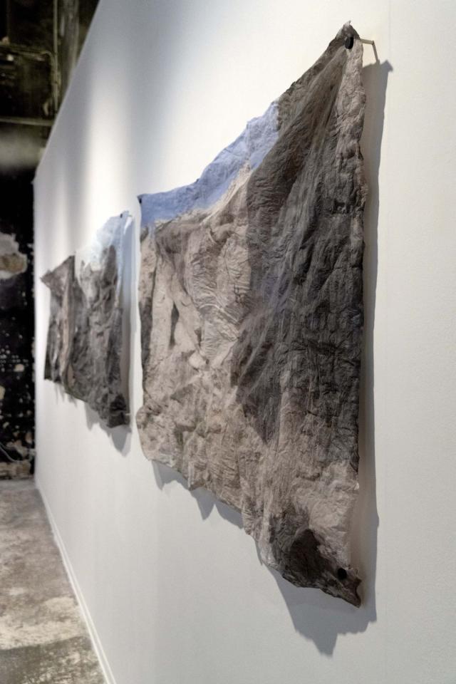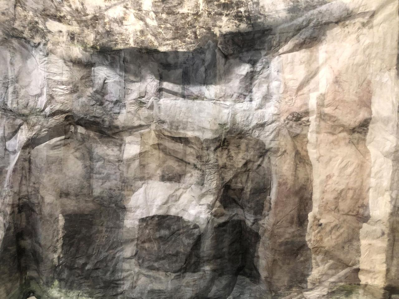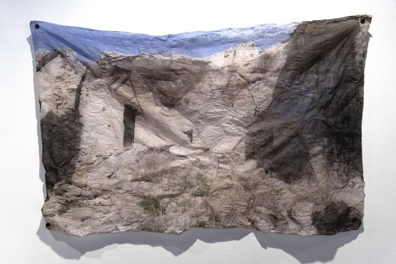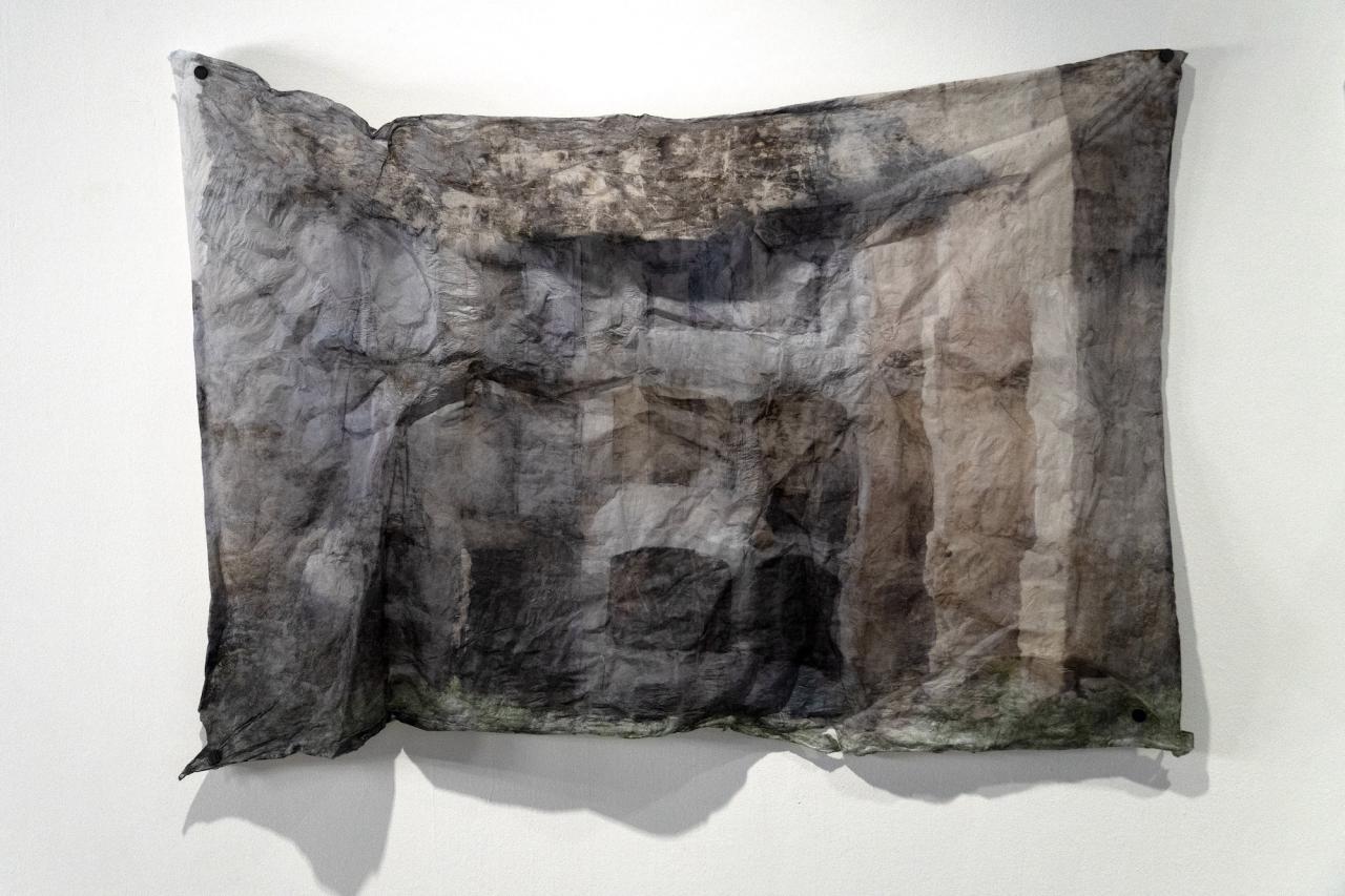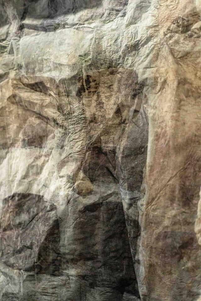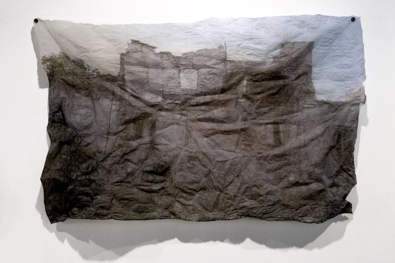 Suaires de Ruines, 2024, tirage sur papier lambda, extraction de la pellicule photographique numérique, 90 x 135 cm, vue de l’exposition collective Sourde Résistance, dans le cadre du Festival international d’art contemporain Sète-Lisboa, Chapelle du Quartier Haut, Sète.