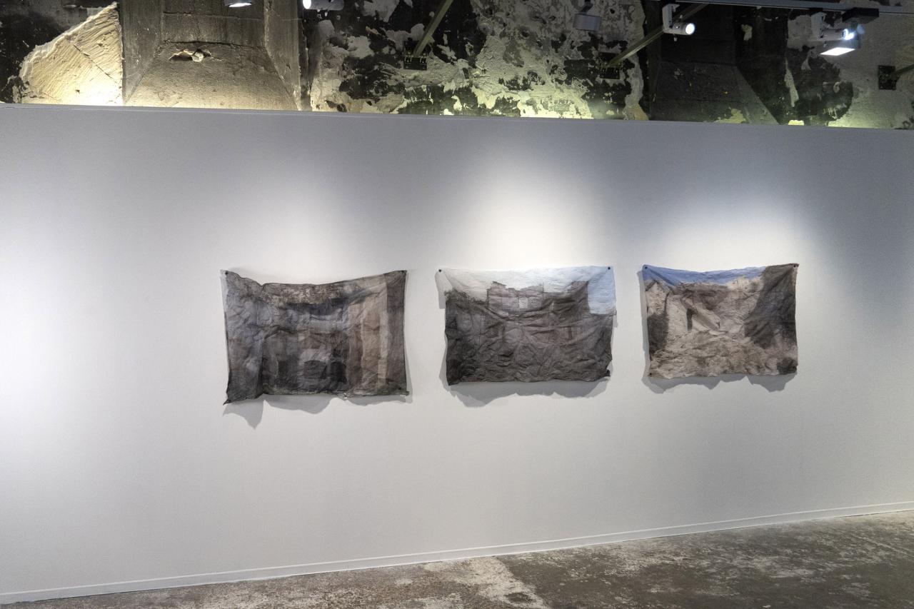 Suaires de Ruines, 2024, tirage sur papier lambda, extraction de la pellicule photographique numérique, 90 x 135 cm, vues de l’exposition collective Sourde Résistance, dans le cadre du Festival international d’art contemporain Sète-Lisboa, Chapelle du Quartier Haut, Sète.