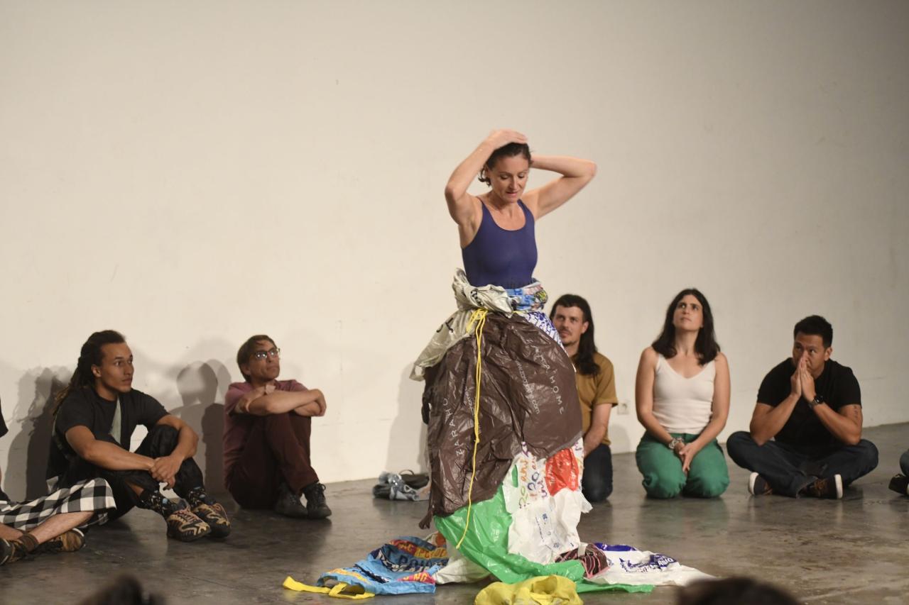 La performance se compose de deux parties : allongée sur un assemblage de sacs plastiques que j’ai cousu à la main, en guise de serviette de plage, je tente de chanter avec de l’eau dans la bouche. La seconde partie, la serviette devient une jupe où je chante une autre chanson au micro.