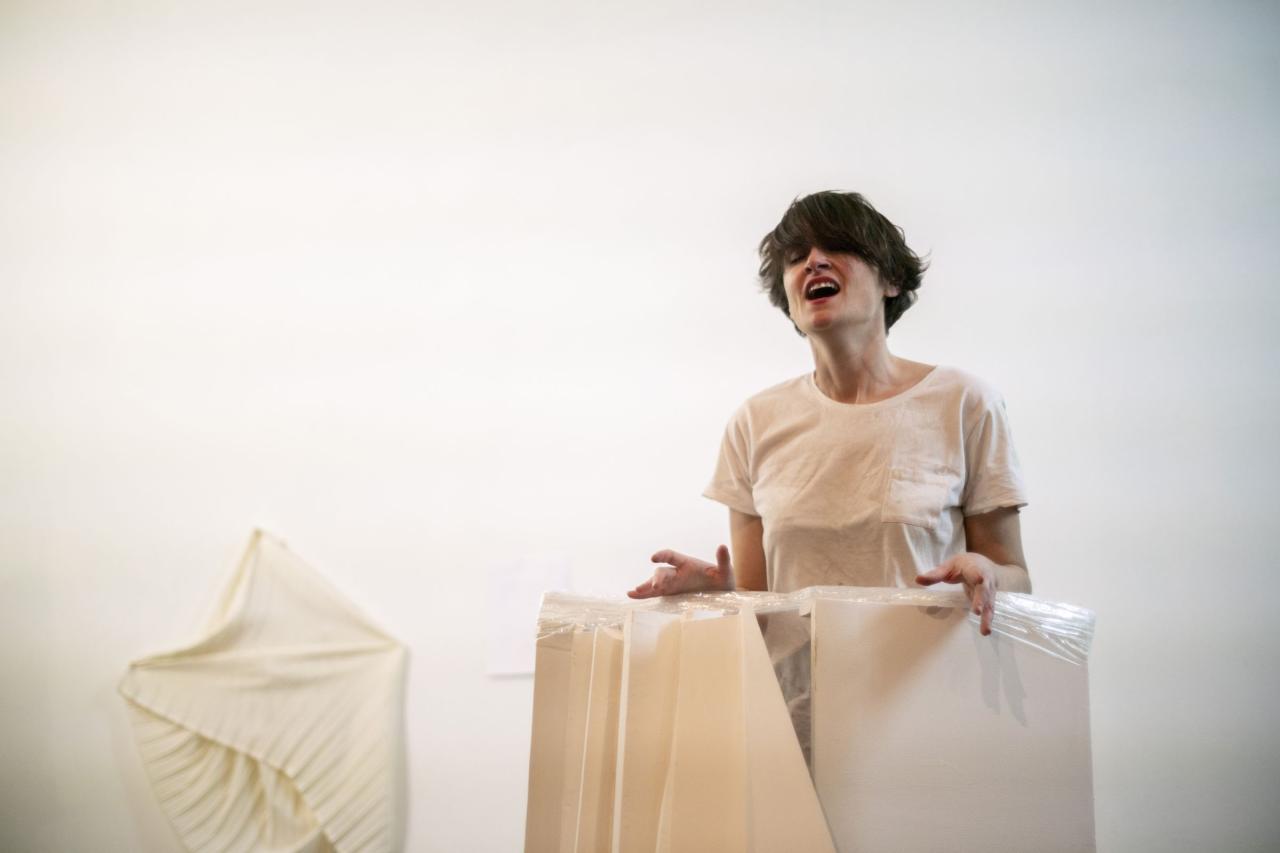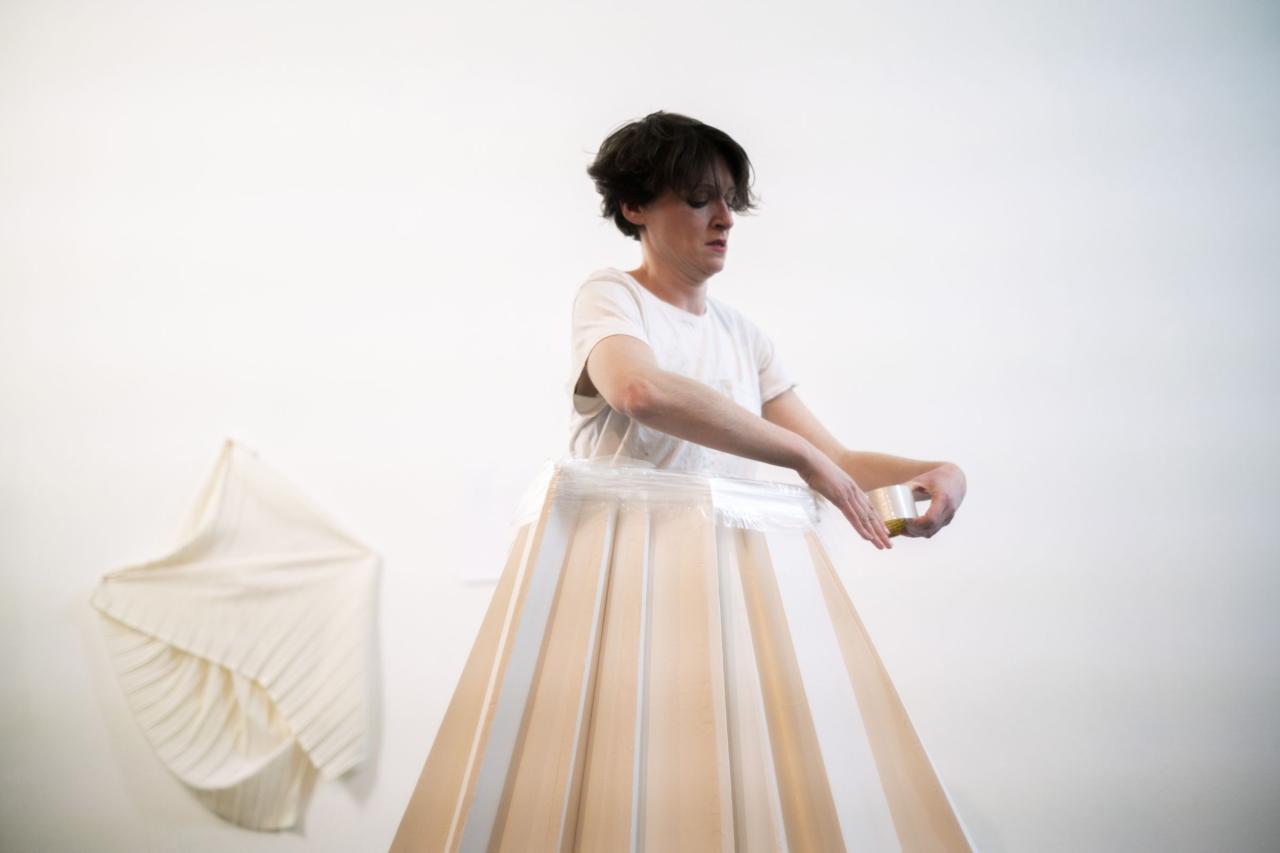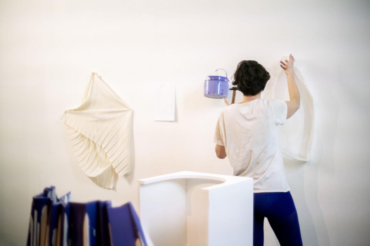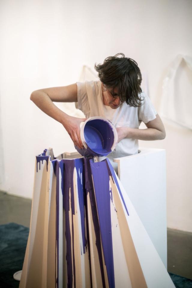 Recouverte de peinture violette à la fin de la performance et posée devant le socle qui accueille les sculptures molles d’Éva Taulois, cette forme devient elle-même un objet sculptural.