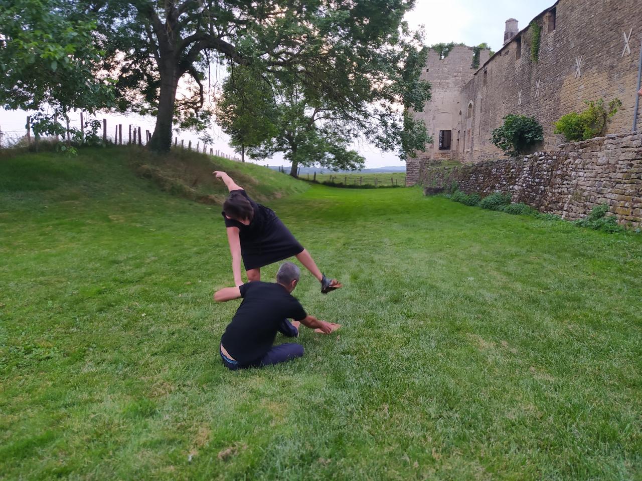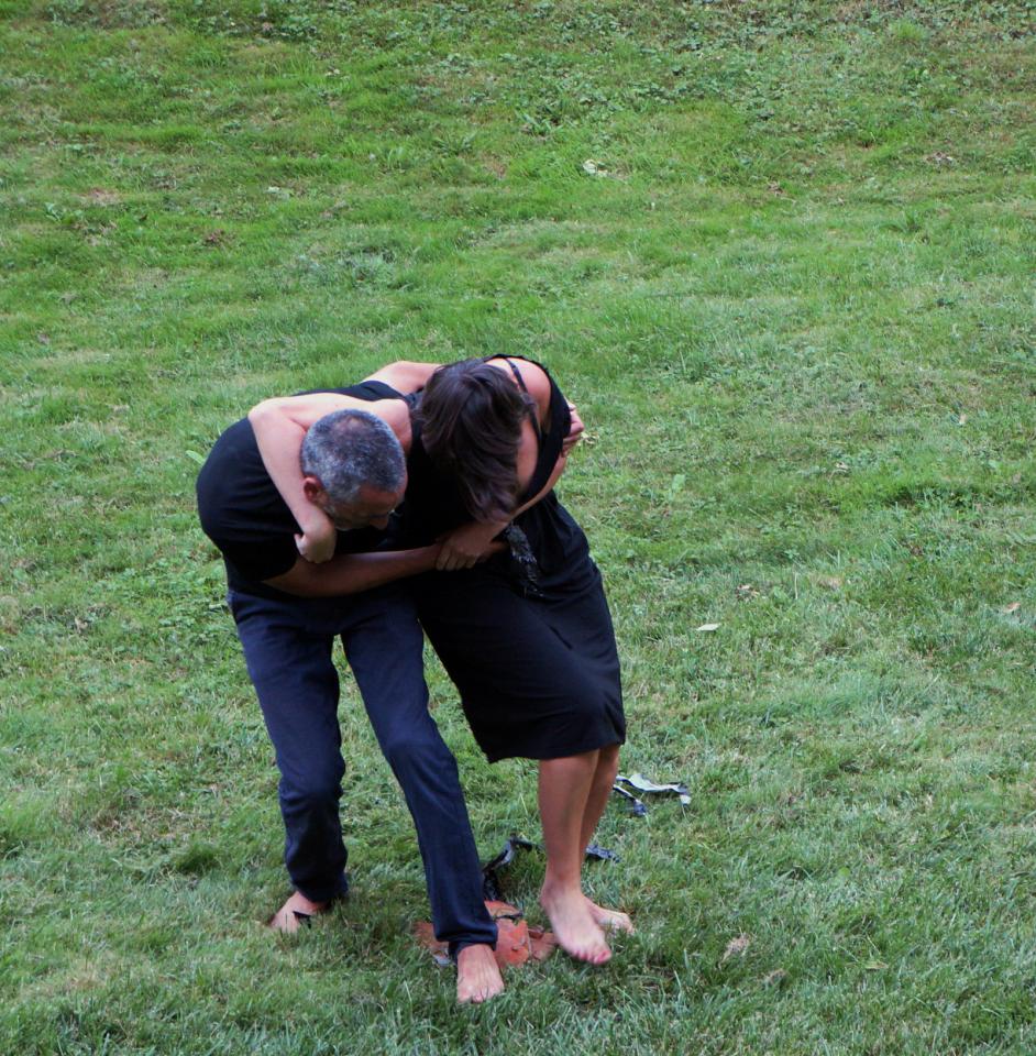 Cette performance s’est construite en collaboration avec Bruno Mercet et à partir de matériaux trouvés sur place et notamment des tuiles en terre-cuite. Avec des tuiles comme chaussures, nous avons mis en scène un jeu subtil et ambivalent entre course, duel ou soutien, à l’image des relations entre hommes et femmes.