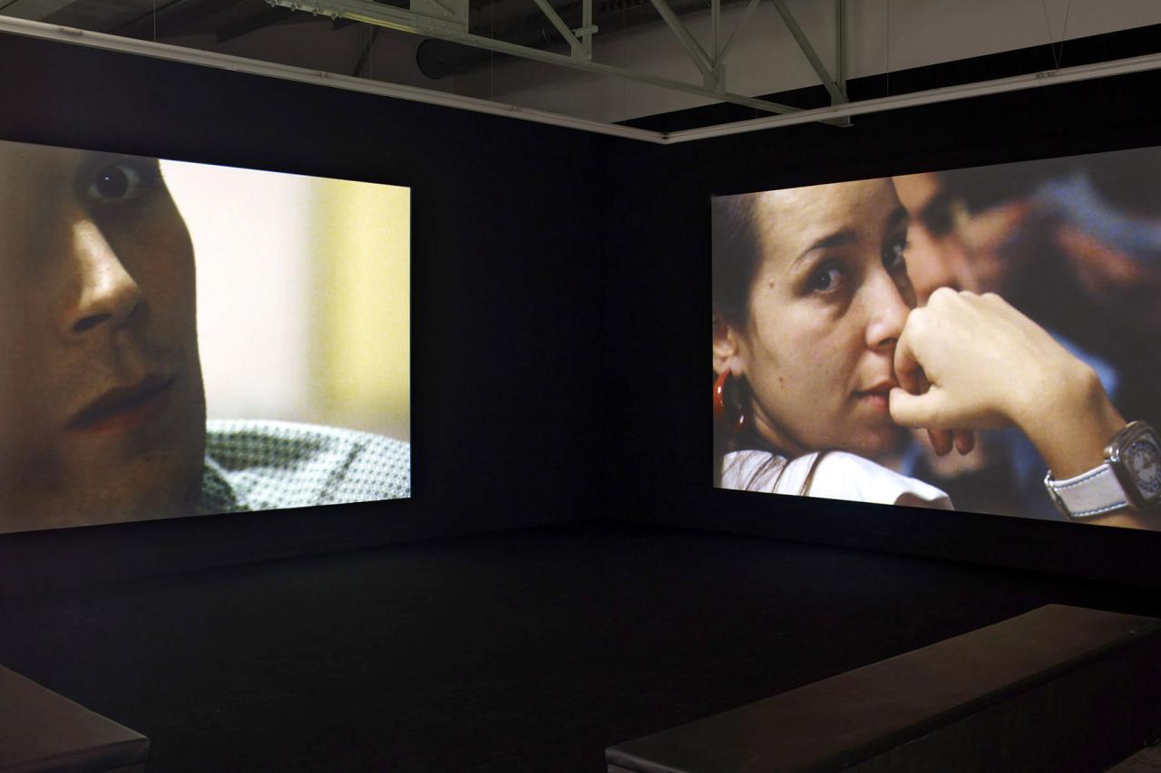 La mirada, 2011, double projection vidéo en boucle, 20 min, vue de l’exposition au Crac Occitanie, Sète, photo Marc Domage