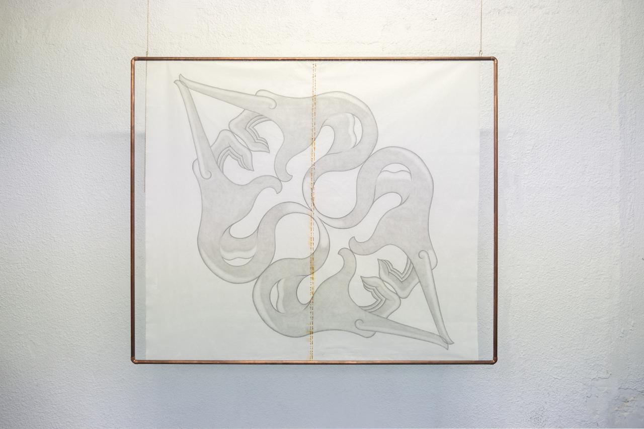Protest Sign (The Horned), 2023, installation, dessin au graphite sur papier de riz cristallisé, de fil de cuivre et d’une structure en tube de cuivre, 98 x 142 x 62 cm, détail