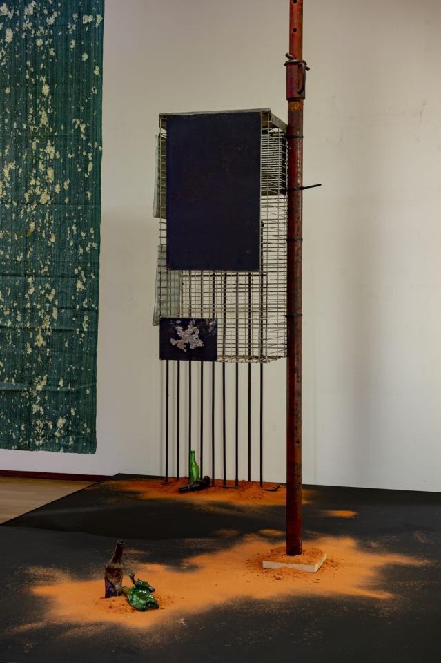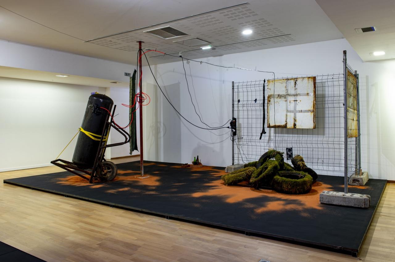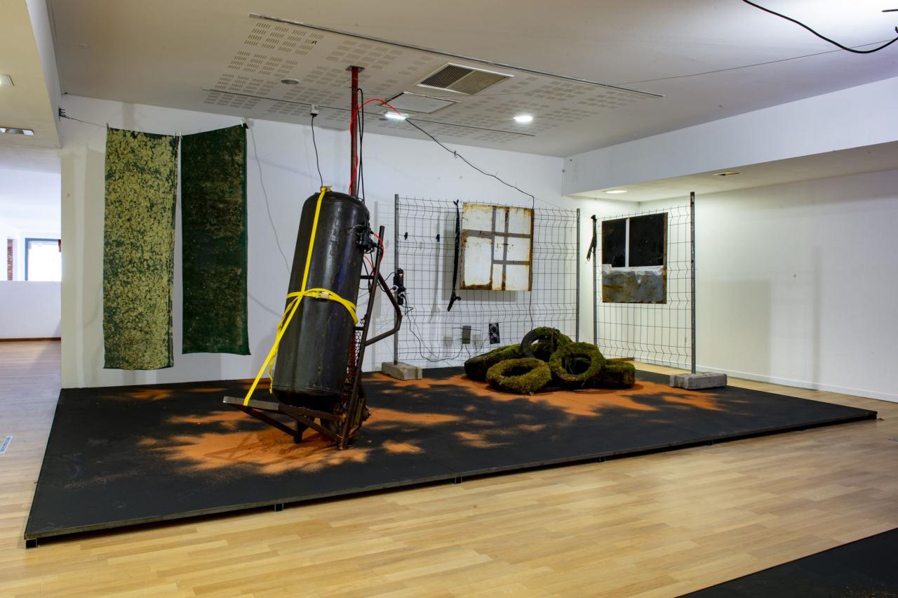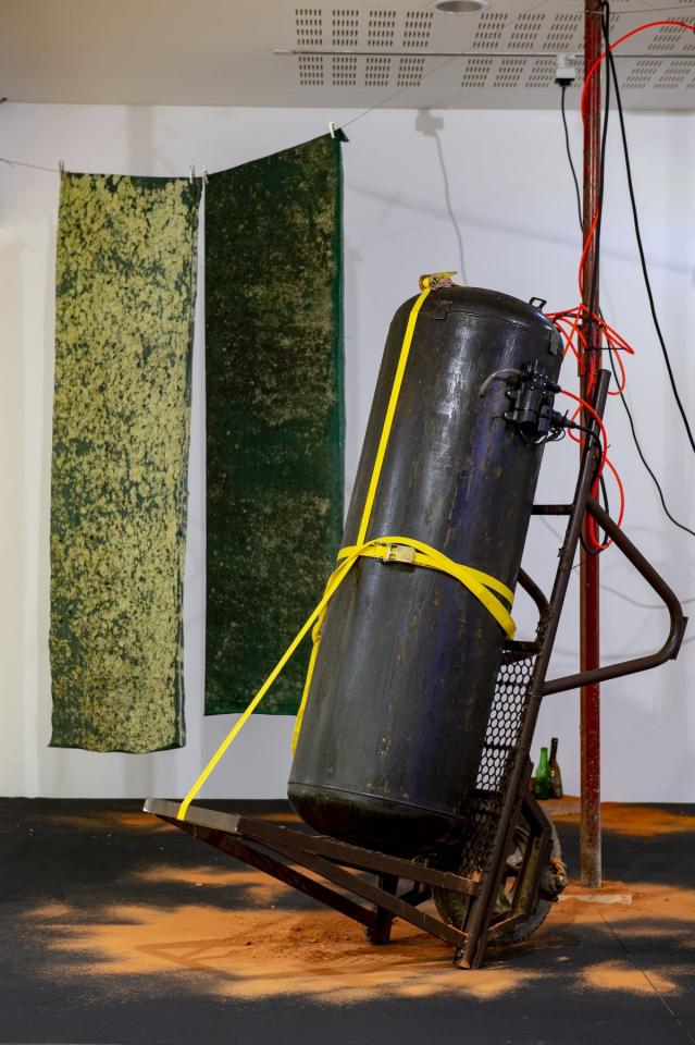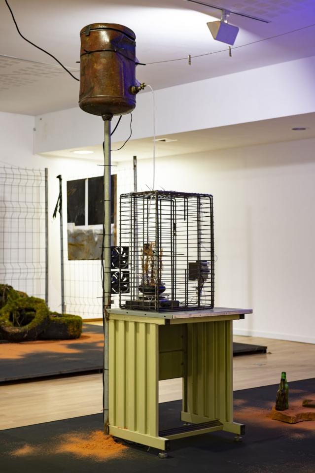 Toiles de brise-vues trouvées en Ariège et dans les Landes, pneus trouvés en lisière de forêt dans le Lot, poussière de brique et mobilier récupérés dans la briqueterie abandonnée de Saverdun, réservoirs d’eau, bonbonnes modifiées et assemblées, armoire métallique partagée durant les études par l'artiste et Adrien Menu modifée pour accueillir un dispositif sonore, brumisateurs, panneau Energy, bières fondues en montagne durant l’estive 2022, étais et grilles de chantier anciennement utilisés pour sécuriser les Ateliers DLKC et socles en bois et acier reprenant la surface du sol de l'atelier de l'artiste.