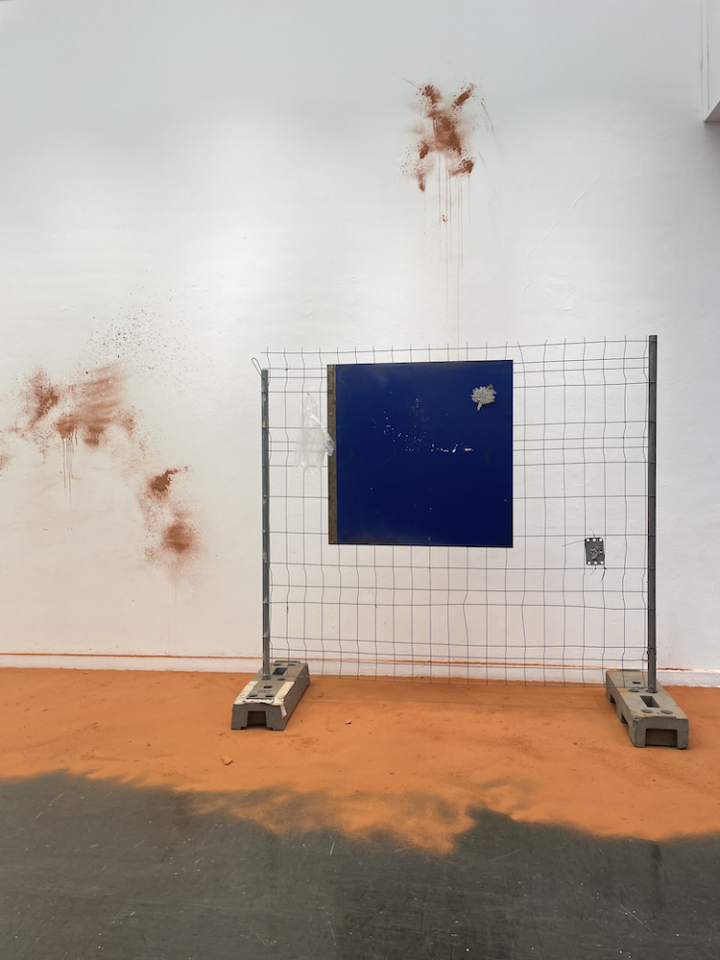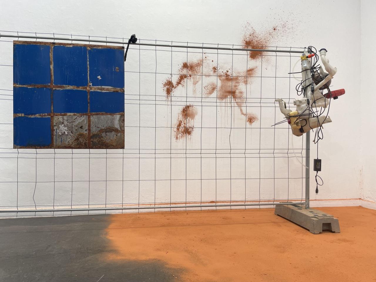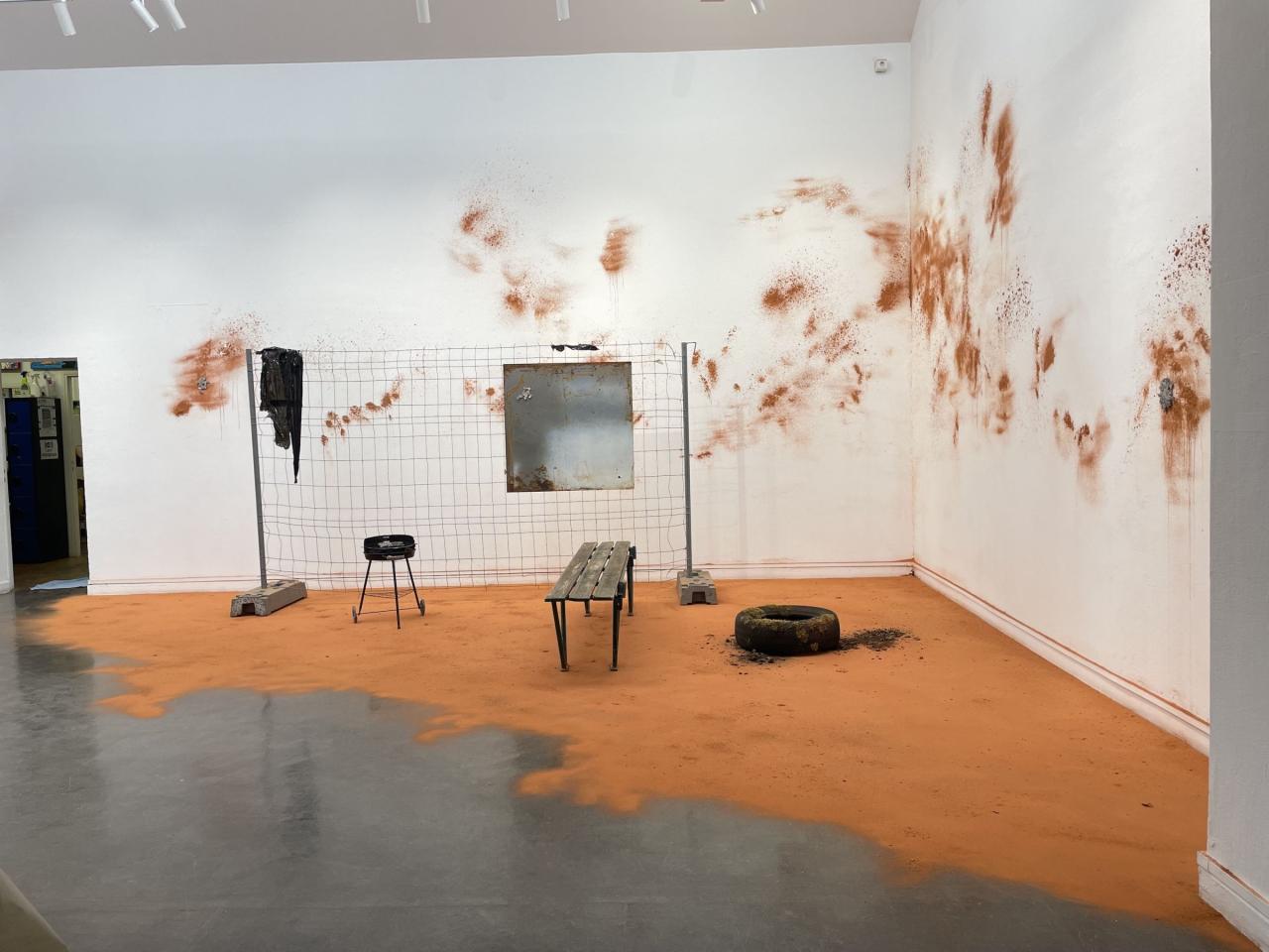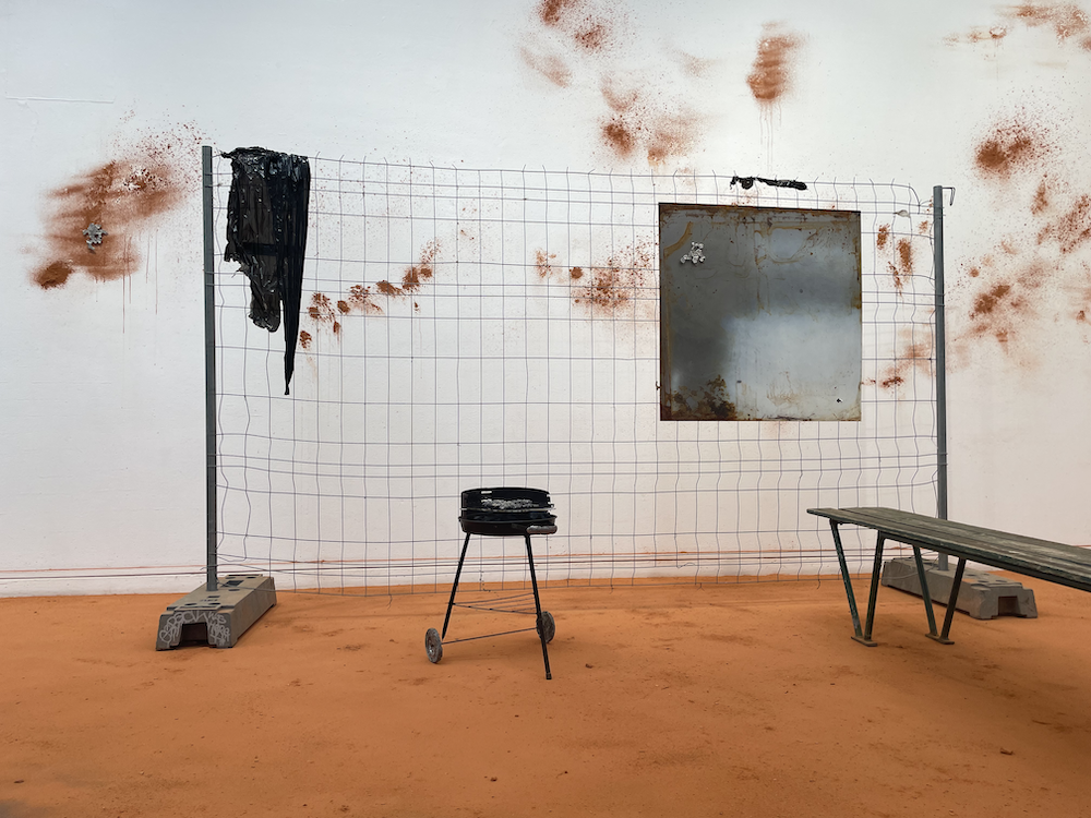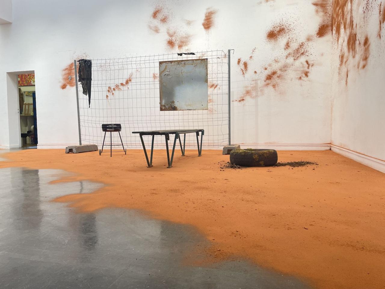 Poussière de brique provenant de la briqueterie abandonnée de Saverdun, barbecue modifié des Ateliers DLKC, banc trouvé dans l’espace public, barrières provenant de la structure anti-effondrement de l'atelier de l'artiste, moulages de dentelles en plomb, pneus trouvés en lisière de forêt dans le Lot.