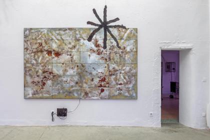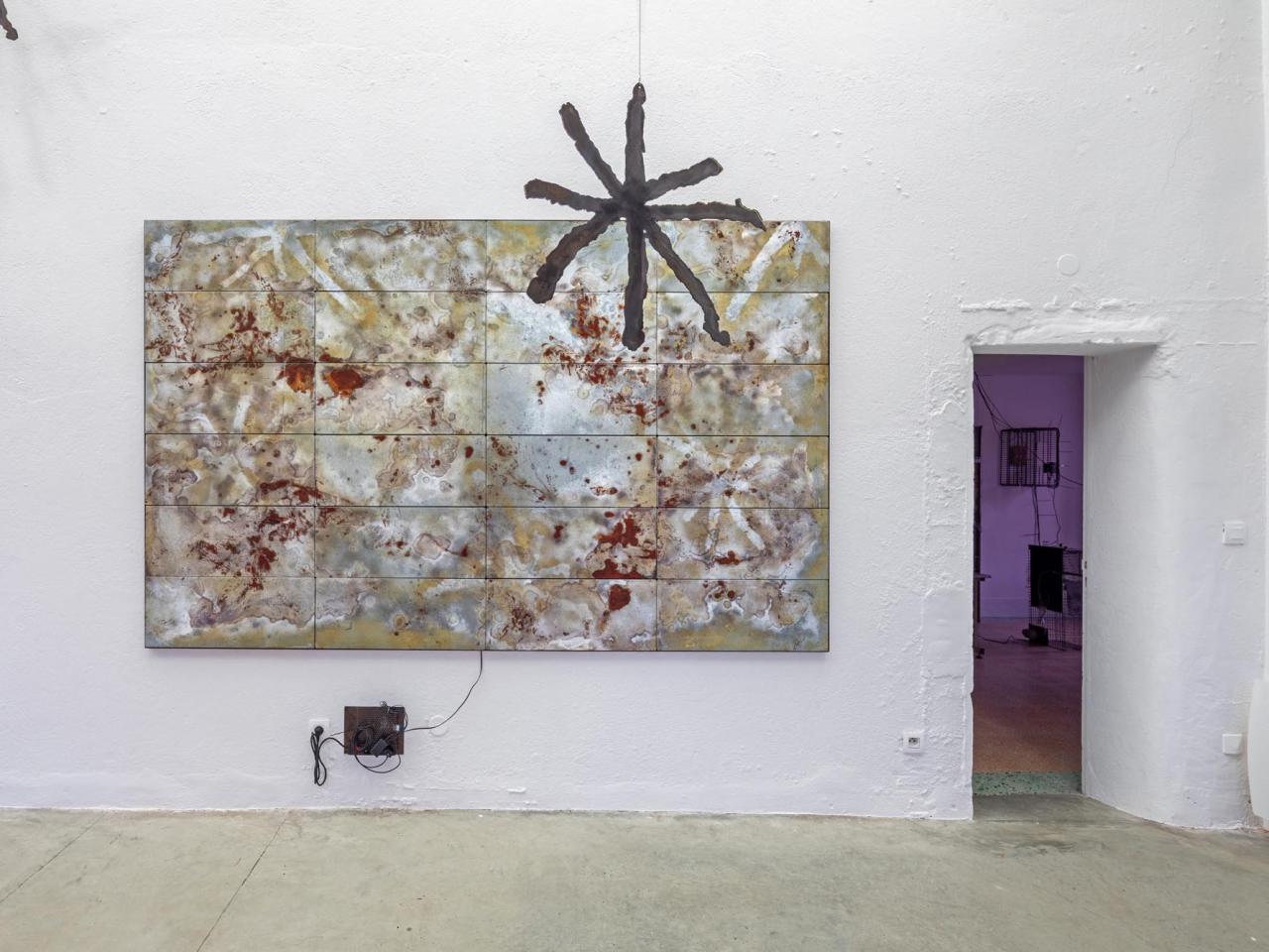 Guilhem Roubichou, STEELstarsACIDsong, 2024, peinture, acier, oxydations, bicarbonate de soude, dispositif sonore ; Étoile, 2024, dessin de Noé découpé au plasma dans de l’acier, vue de l’exposition personnelle Codetta, Maison Salvan, Labège, 2025, photo Vincent Boutin