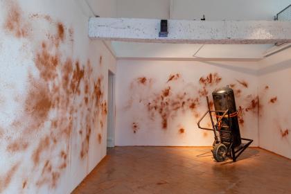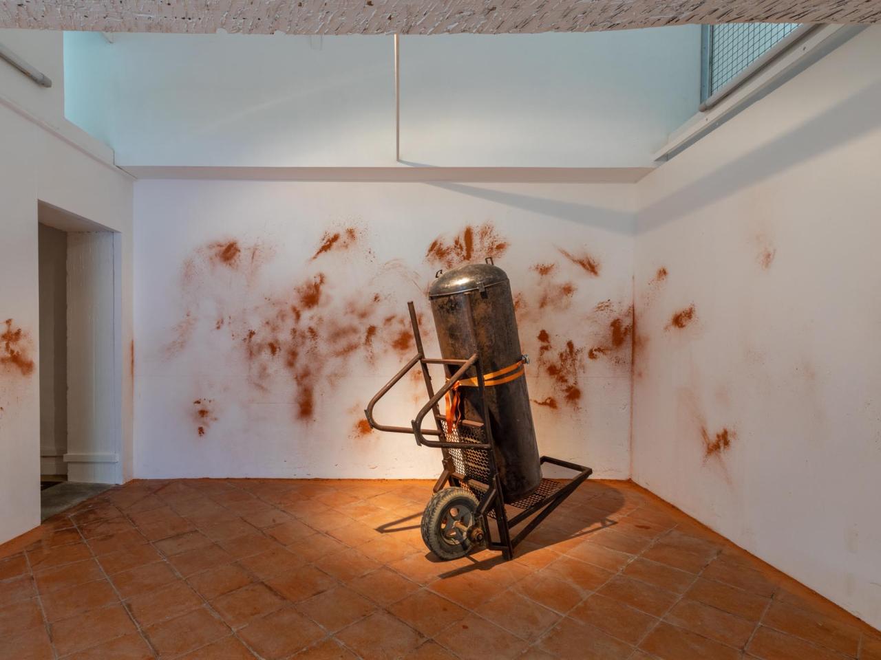 Guilhem Roubichou, Expressions roses, 2020, protocole de peinture murale à partir de poussière de brique ; Parfum Saverdun3 par Studio Flair ; Assemblage n° 5, 2025, ossature cumulus et brouette récupérées dans la briqueterie, vue de l’exposition personnelle Codetta, Maison Salvan, Labège, photo Vincent Boutin