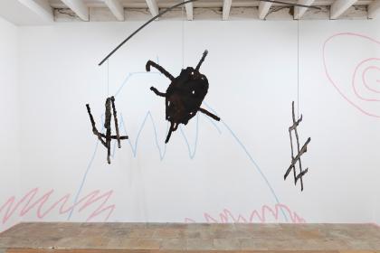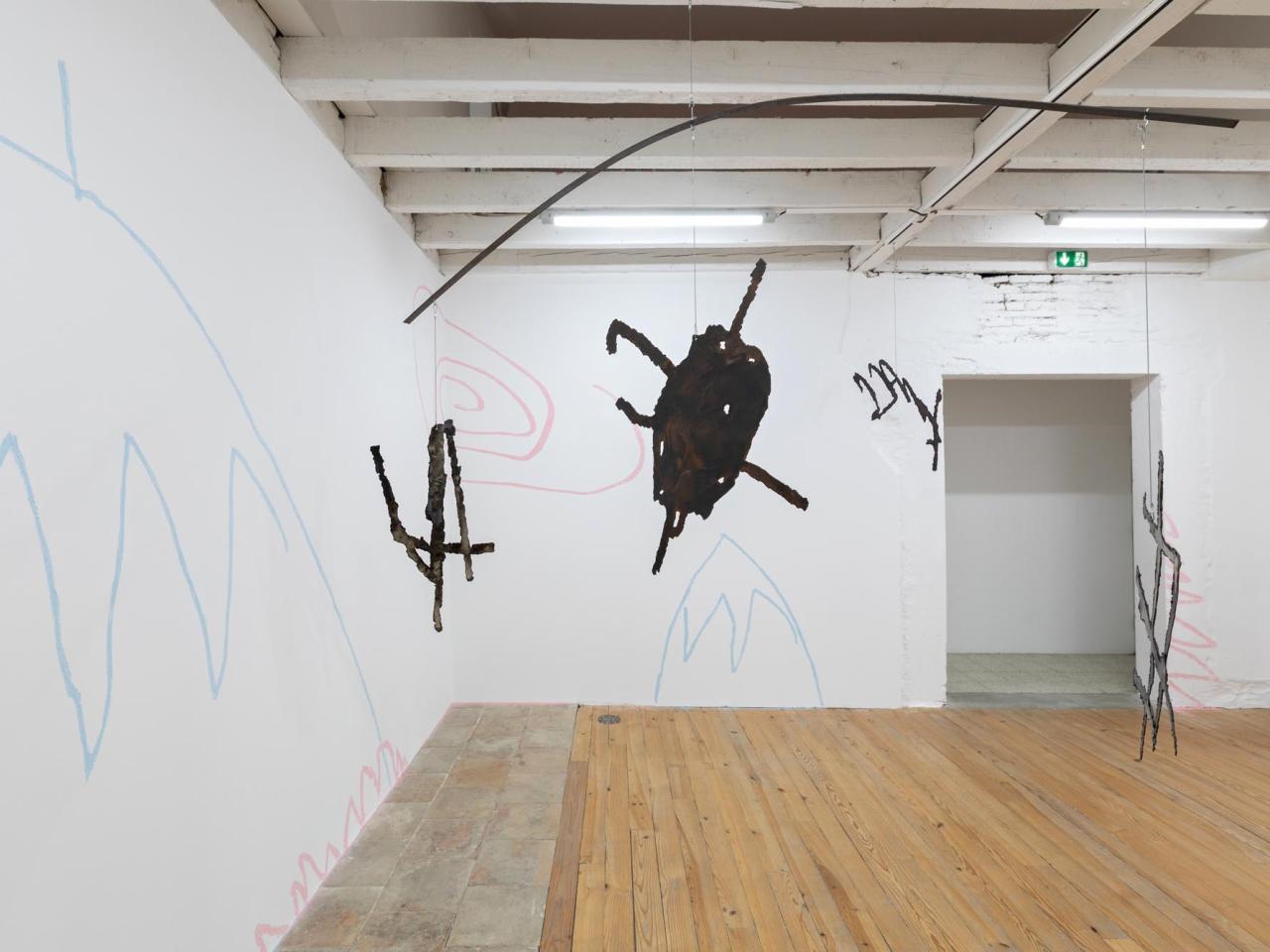Guilhem Roubichou, Carte au trésor, 2024, peinture murale à la craie reprenant différents dessins/cartes aux trésors de Noé, détail ; Mobile, 2024, acier, signature de Noé, découpe au plasma, vue de l’exposition personnelle Codetta, Maison Salvan, Labège, photo Vincent Boutin