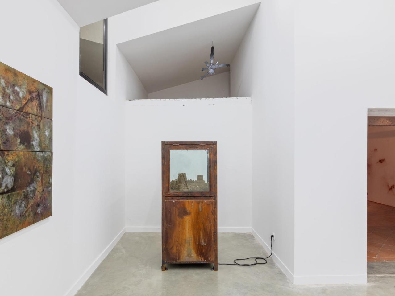 Guilhem Roubichou, STEELrainbowACIDstereo, 2024 - 2025, peinture acier, oxydations, dispositif sonore ; Ruine à l’envers, 2024, château de sable en vitrine, sable de la plage de la barre Anglet, brumisateurs, vue de l’exposition personnelle Codetta, Maison Salvan, Labège, photo Vincent Boutin