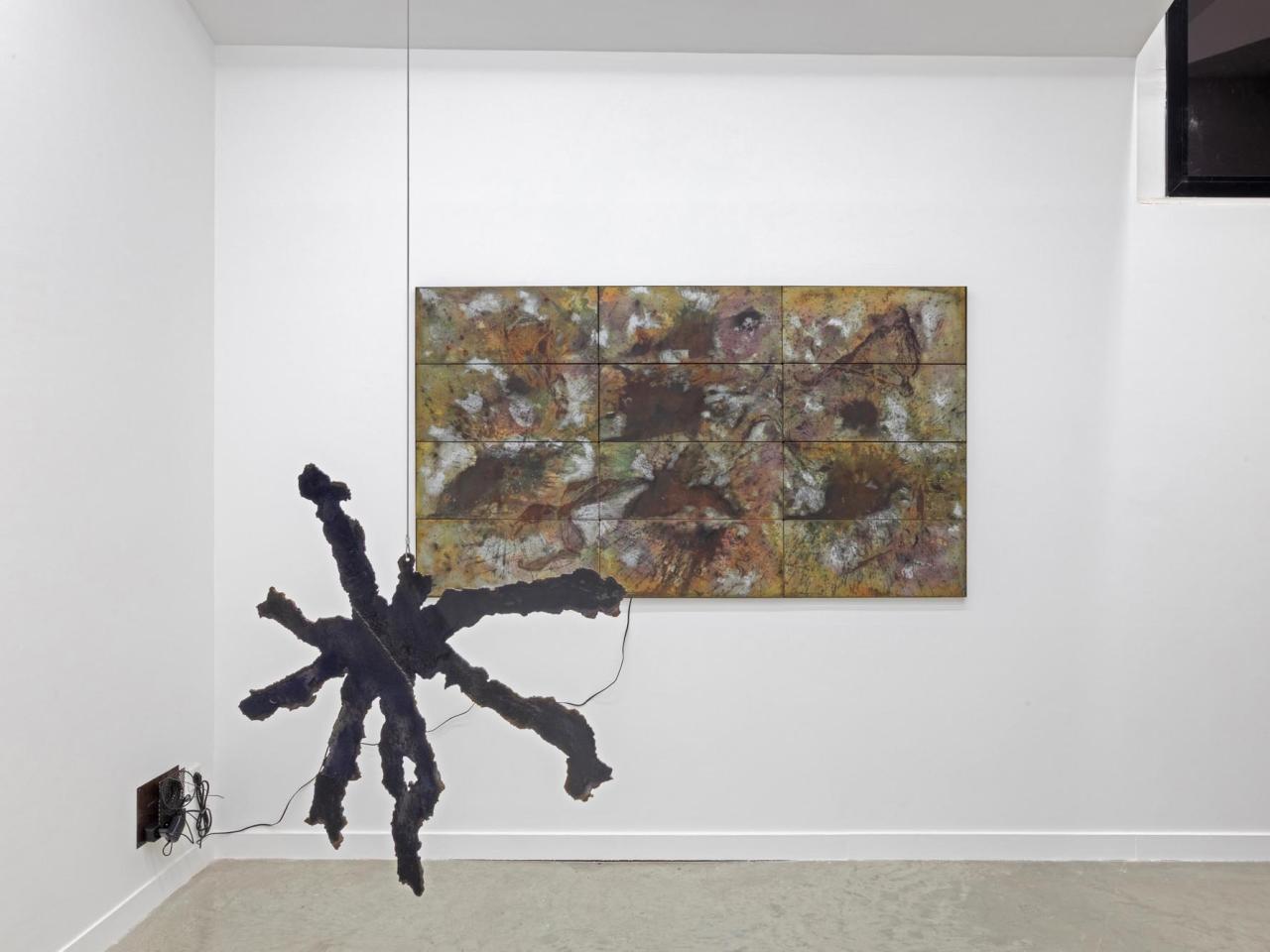 Guilhem Roubichou, STEELpurpleACIDstereo, 2024 - 2025, peinture acier, oxydations, dispositif sonore ; Étoile, 2024, dessin de Noé découpé au plasma dans de l’acier, vue de l’exposition personnelle Codetta, Maison Salvan, Labège, photo Vincent Boutin