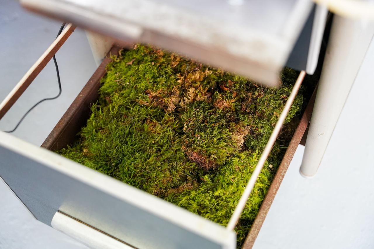 M.L : Le végétal tient une place prépondérante dans ton travail. Et pourtant, dans cette exposition, sa présence est discrète, débordante d’un tiroir, poussant comme des mauvaises herbes, suggérée par des formes émergées d’un bain de sulfate de cuivre et soutenue par un subtil dispositif olfactif. Tu joues finalement davantage de l’absence du végétal dans cette installation que dans tes précédentes expositions. Pourquoi ?