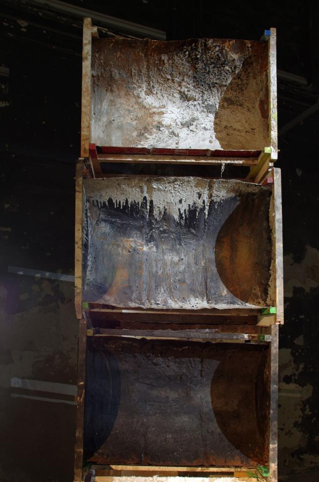 Réalisées en résidence dans les ateliers de la ville durant le mois précédant l’exposition, Matrice et Épreuves, respectivement dalle de béton et de peinture et vastes toiles estampées au cours de la fabrication de celle-ci, intègrent l’espace de la chapelle, en prolongent les murs noircis, en réorganisent les perspectives. Autour de ce geste central, des corps étranges dansent, entre outils et rebus du chantier. Des objets manufacturés, glanés au fil des reconnaissances puis pétrifiés dans un enduit ferrugineux oxydé à l’eau de mer donnent lieu à des formes tortueuses, indéfinies.