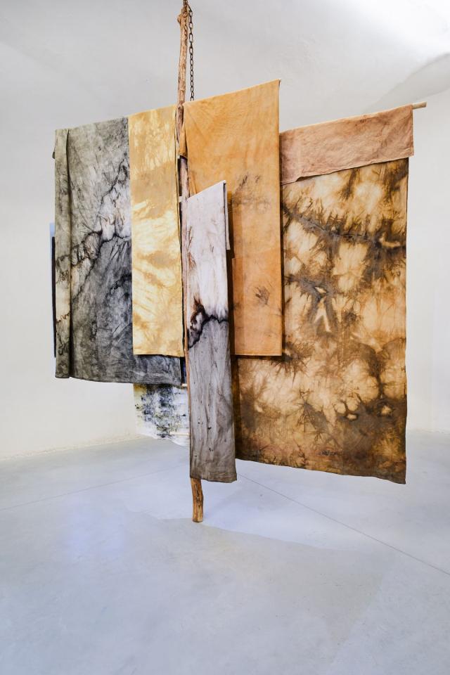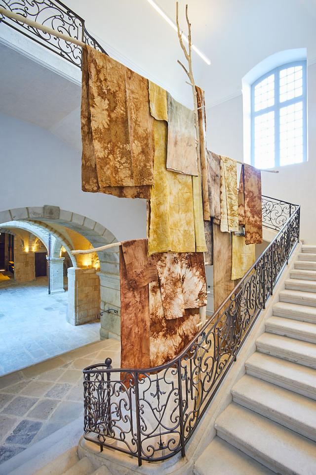 Echelle+Braîches, 2024, installation, draps, teintures végétales et bois, vue de l’exposition Dans une rouge Clairière, 2024, le Château Centre d’Art Contemporain et du Patrimoine d’Aubenas, Aubenas, photo Laurent Lecat
