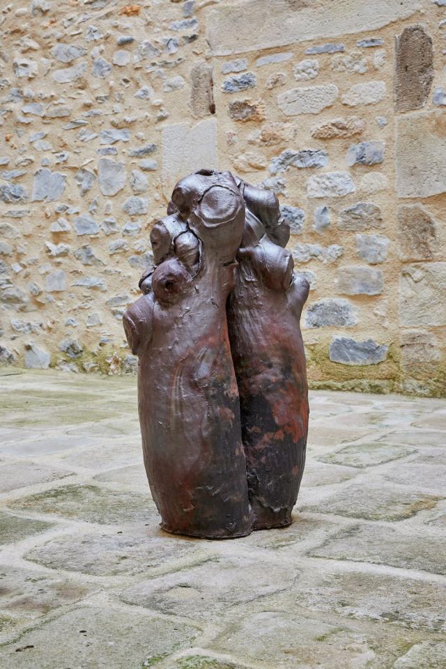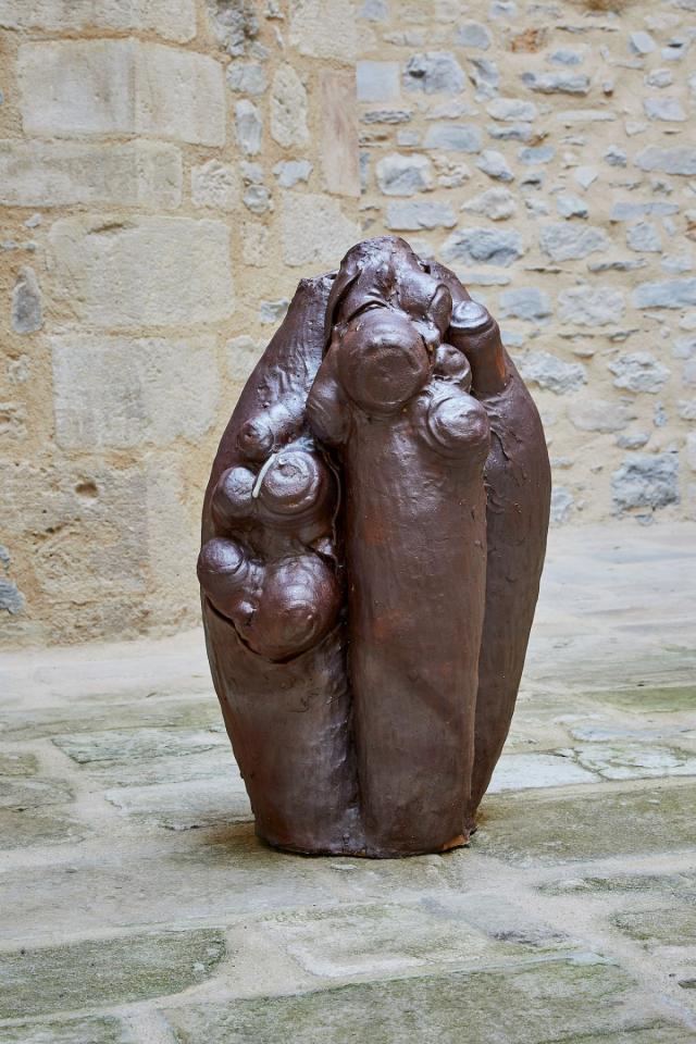 Trogne, 2024, sculpture, grès et terre de cueillette, vue de l’exposition Dans une rouge Clairière, 2024, le Château Centre d’Art Contemporain et du Patrimoine d’Aubenas, Aubenas, photo Laurent Lecat