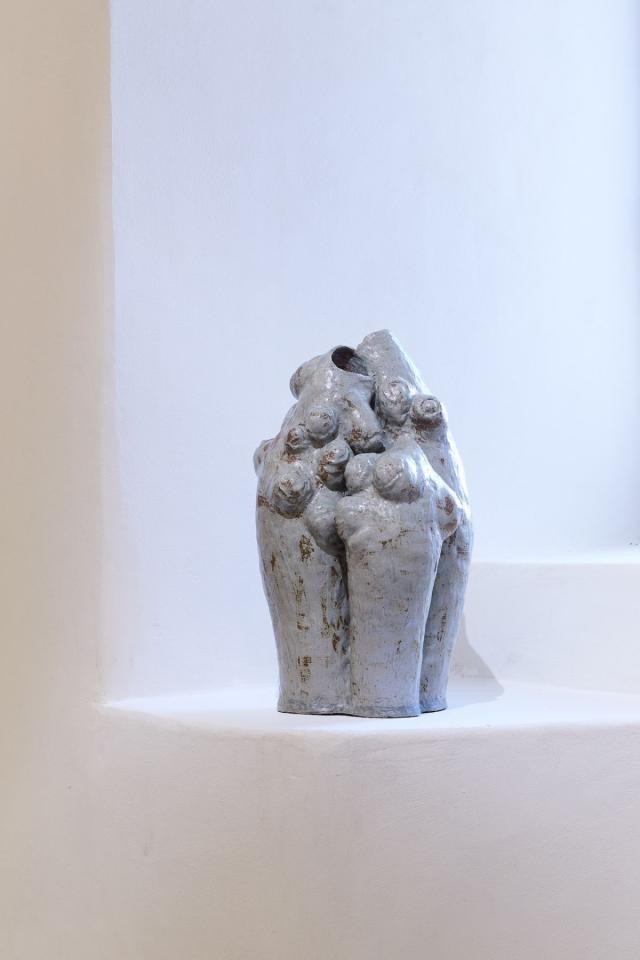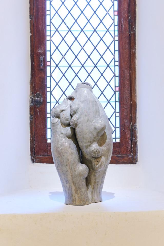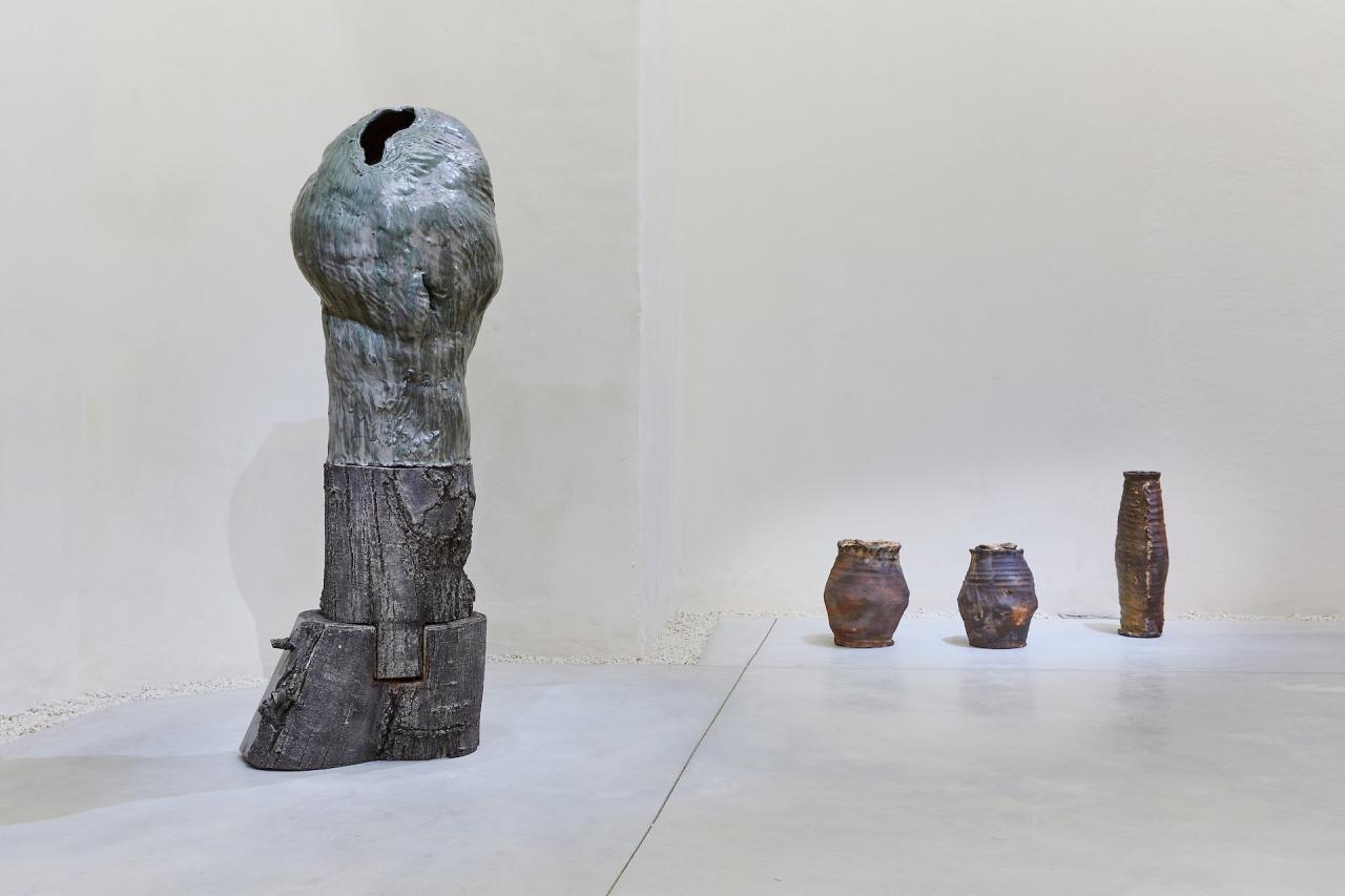 Pott, 2024, sculpture, grès, émail de cendres de tilleul et bois, vue de l’exposition Dans une rouge Clairière, 2024, le Château Centre d’Art Contemporain et du Patrimoine d’Aubenas, Aubenas, photo Laurent Lecat