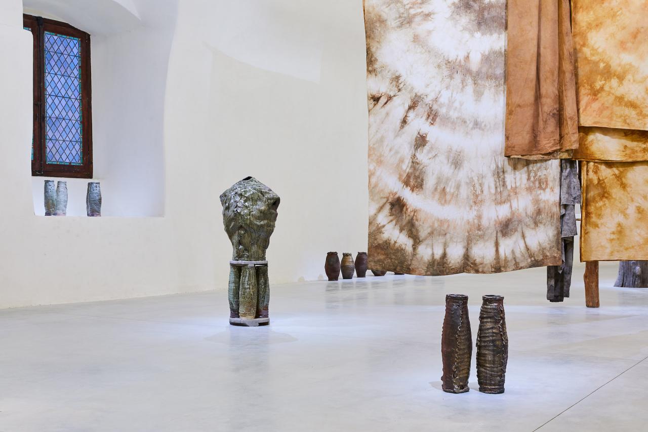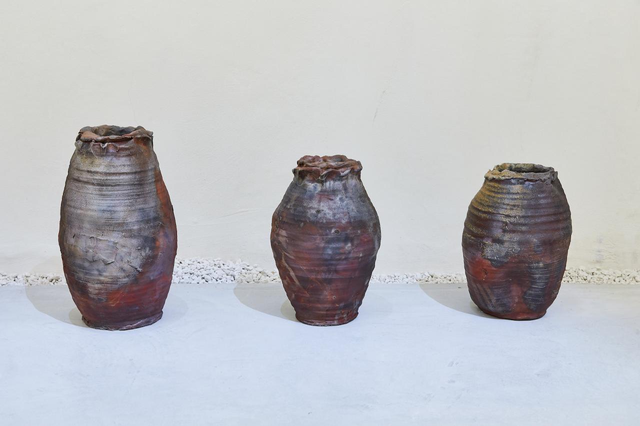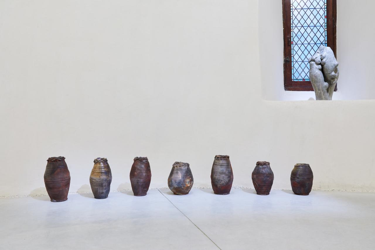 Vaisseaux, 2024, sculptures, grès brut, vue de l’exposition Dans une rouge Clairière, 2024, le Château Centre d’Art Contemporain et du Patrimoine d’Aubenas, Aubenas, photo Laurent Lecat
