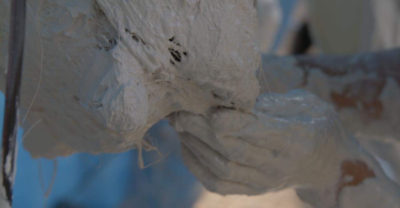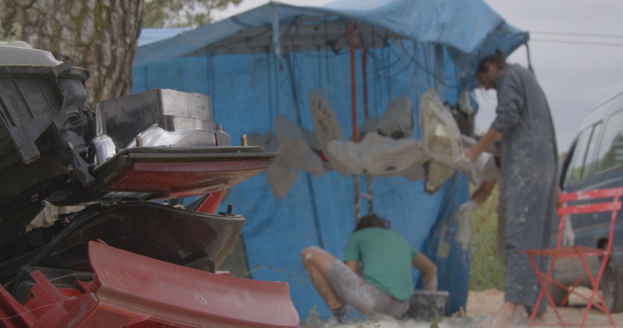 « Des lampes, faîtes de phares de voitures enduits de filasse, de plâtre et de limaille de fer, reviennent souvent ponctuer nos expositions, entre dispositif d’éclairage et sculptures. Nous avions le désir d’en faire une installation plus conséquente, qui révèle ce jeu de lectures : sculptures de plâtre, blocs de calcaire en lévitation le jour et panache de faisceaux lumineux la nuit.