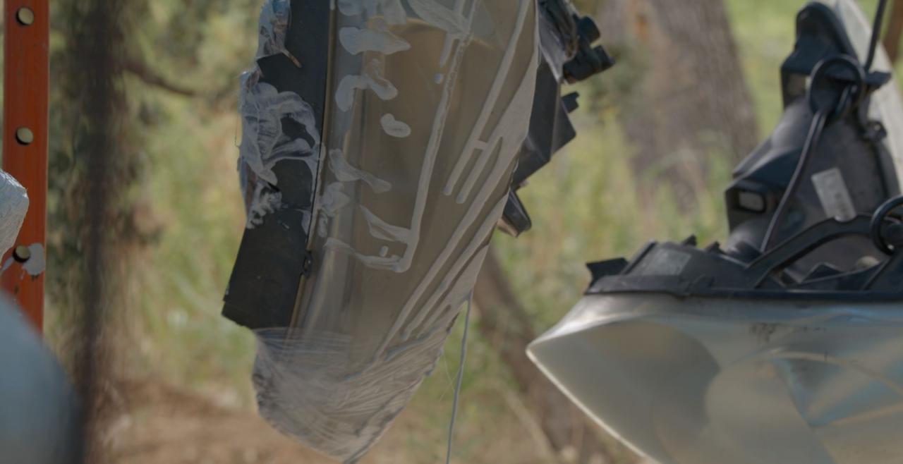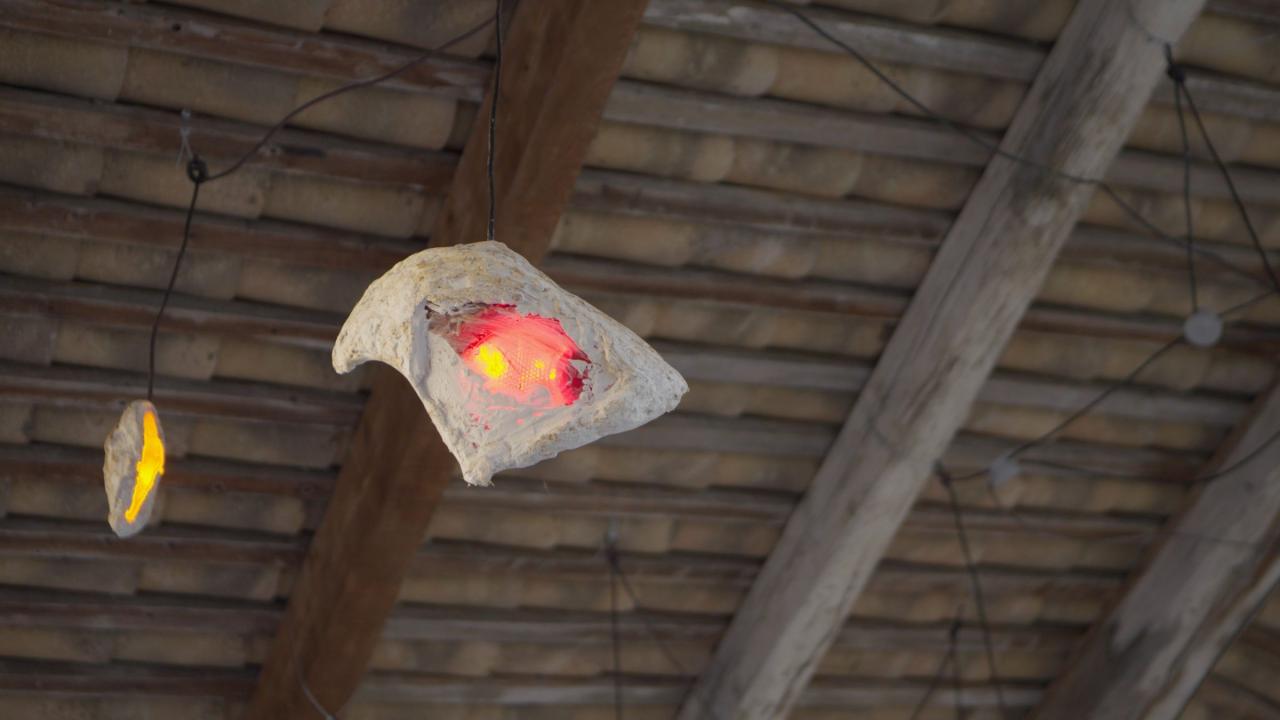 Karst, 2021, installation, optiques de voiture, led, plâtre, limaille de fer et câbles électriques, dimensions variables, vues de l’exposition collective Ensem, 2021, Montpeyroux, un projet du MO.CO et de la commune de Montpeyroux, détail