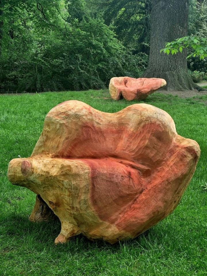 […] il y a la volonté de pratiquer des creux où s’asseoir, de la place pour un ou plusieurs corps. Que ce soit des sculptures qui permettent l’expérience de la rencontre avec l’arbre. Les assises, les dossiers, les accoudoirs forment aussi des corps, des corps abstraits, des corps qui accueillent d’autres corps. Le jardin est un genre de sanctuaire. Les arbres qui le peuplent vivent au contact des générations d’usagers et de jardiniers, c’est le lieu où la rencontre s’opère. Il est aussi une parabole, celle d’un espace clos dont l’humanité a la charge : le jardin planétaire. Aborder cette matière, en ces lieux, cela n’a rien d’anodin. Nous nous y sommes mis avec humilité. Pour parler de notre manière de travailler, nous disons souvent que le faire, la fabrication, guide les formes et la réflexion. Travailler avec cet arbre, et dans le contexte du jardin, a engendré ces formes, fait surgir mille sensations et mille pensées. Ainsi, quelque part, grâce à ces six reliques, cet arbre, ce sequoia géant âgé de plus de 120 ans perdure, sous une forme nouvelle, que nous avons voulu à la fois collective et intime.