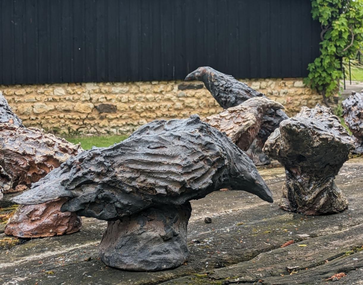 Dans le Jardin de Boisbelle, à la sortie du four, les Couales, corbeaux de grès formés à quatre mains à mi-chemin entre la tradition des épis de faîtage, élément architectural qui orne les toits du berry, et sculptures zoomorphes, ont peu à peu envahi la table d’Hervé Rousseau, sept traverses de chemin de fer qui reposent sur une série de quatre pots “pieds d’éléphants”.