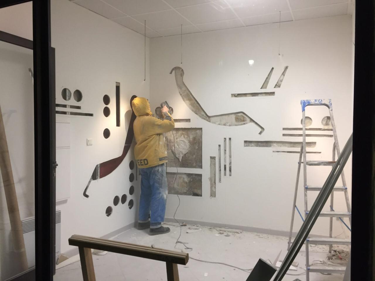 L’absence de ces mêmes pièces laissant des jours dans les murs, révèle l’envers du décor de l’espace d’exposition, laisse apparaître l’atelier, les stocks, les outils, la régie, tous éléments indispensables au travail artistique et à sa monstration.
