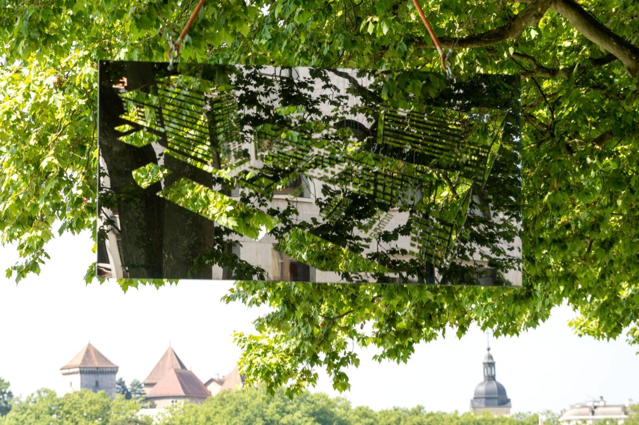 Natures / Architectures / Natures, 2022, inox poli miroir, 300 x 150 x 0,6 cm, oeuvre dans l’espace public, festival Annecy Paysages, photo Marc Domage