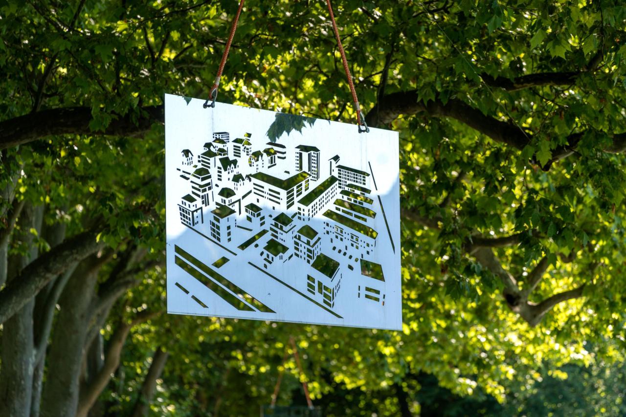 Dans ces grandes plaques, miroirs de métal, se pose le reflet sans cesse changeant du lac et de la ville. Suspendues aux arbres de la promenade d’Albigny, elles portent en creux les plans des bâtiments avoisinants. Jean Denant rend ainsi inséparables nature et urbanisme…