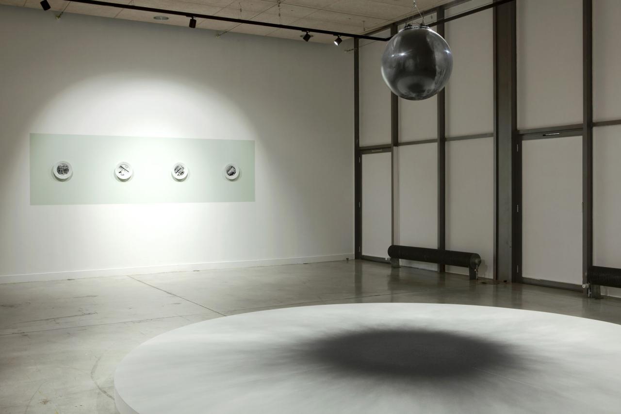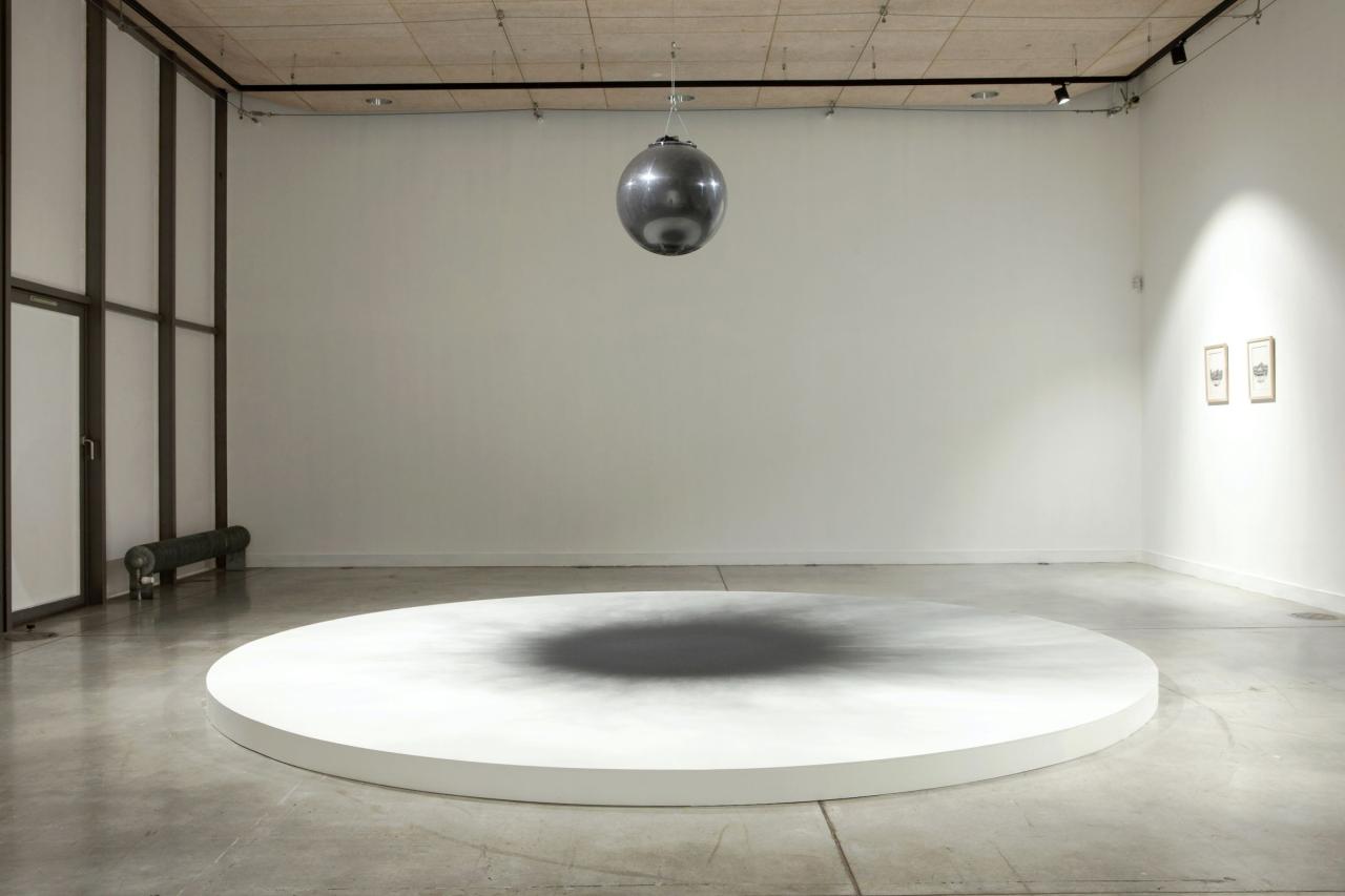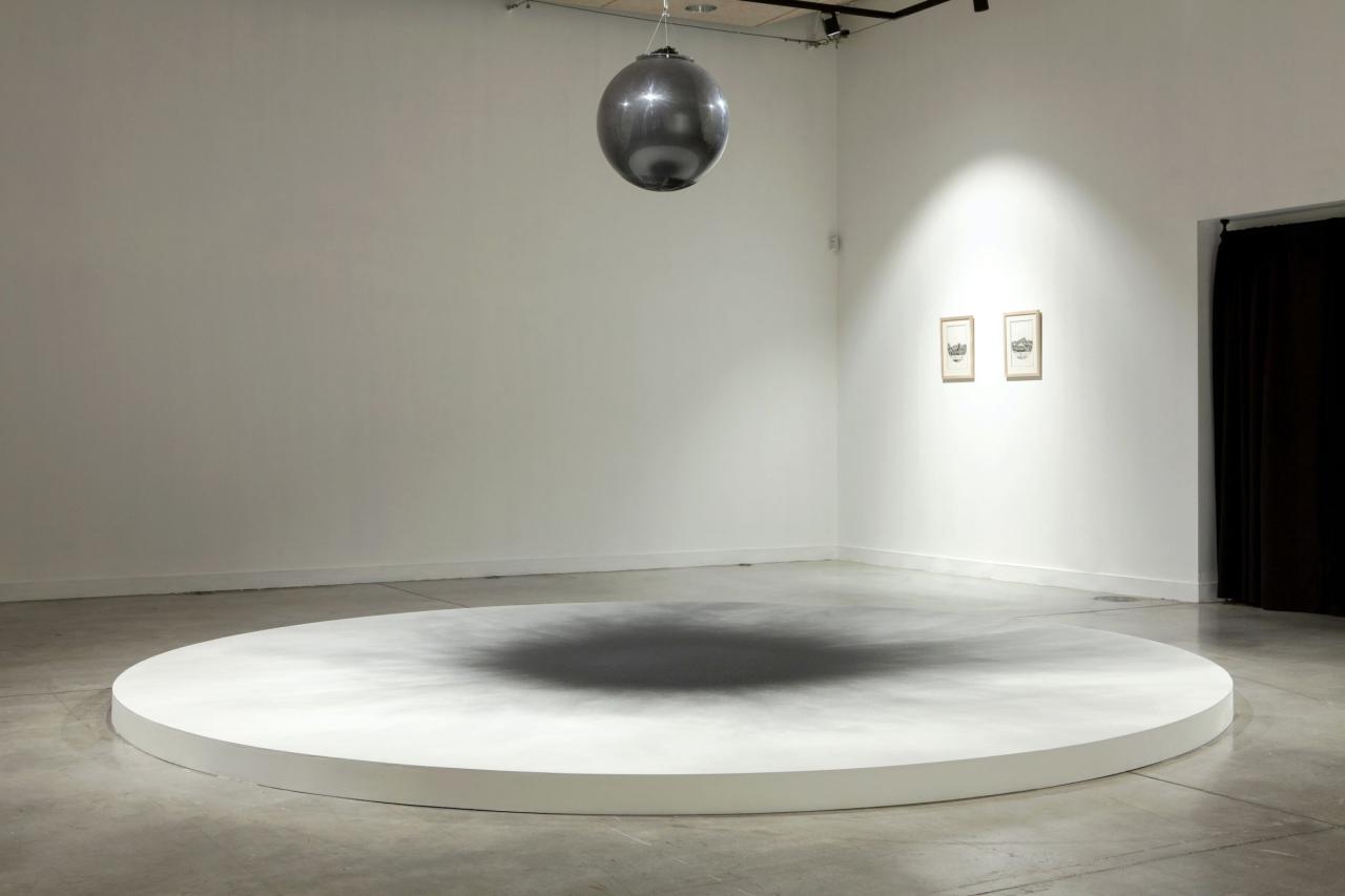 Pendue au bout d’une poulie, une sphère remplie de charbon (lâchée du haut vers le bas et sèchement retenue) a dispersé son charbon, en un halo de poussière. Une explosion sourde, dont il ne reste que la trace fragile, volatile, éphémère.