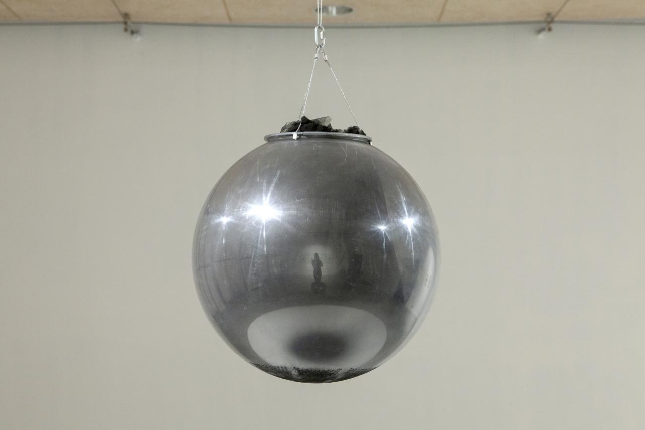 Charbon, amplitude 01, 2024, installation, poudre et morceaux de charbon de bois, sphère en plexiglas percée de 786 trous de 3mm, tulle, corde, poulies, câbles zinc, photo Phœbé Meyer