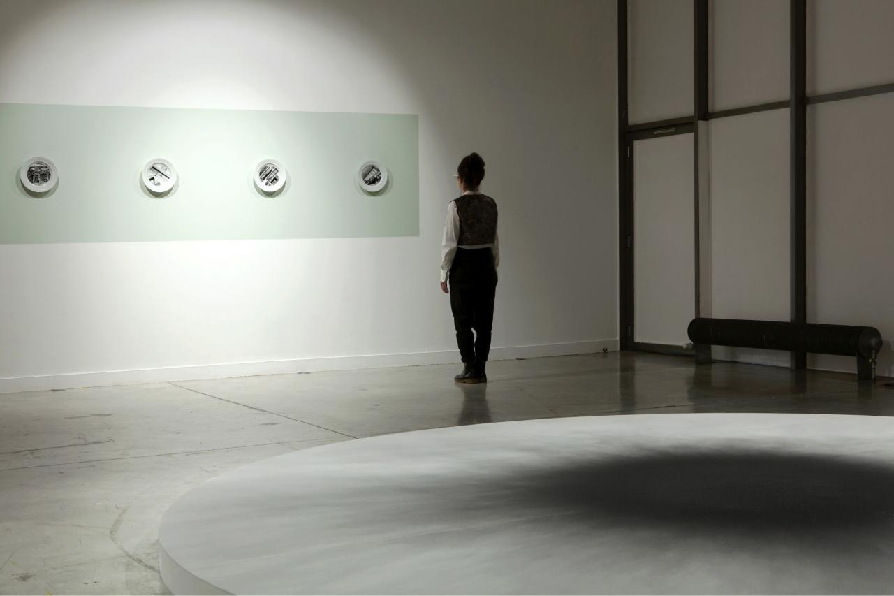 Soupe Grasse 02, 03, 01, 04, 2024, installation, sérigraphies sur assiettes, diamètre 25,6 cm, Vue de l’exposition À l’ombre de nos sommeils, 2024, Musée-mine départemental, Cagnac-les-Mines, photo Phœbé Meyer