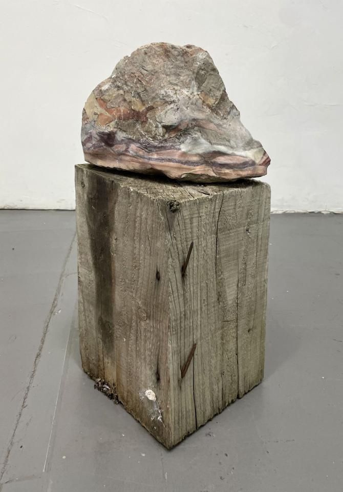 Pierre Caresse, 2022, marbre et bois, 50 x 20 x 20 cm, vue de l’exposition Con moto, 2022, Le Salon Reçoit, Toulouse