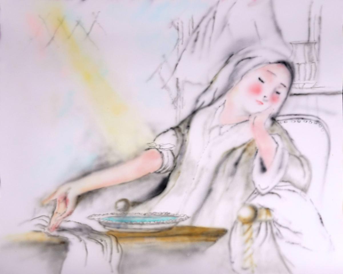L’Annonciation, 2020, peinture acrylique sur papier, 124 x 152 cm, vue de l’exposition Con moto, 2022, Le Salon Reçoit, Toulouse, détail